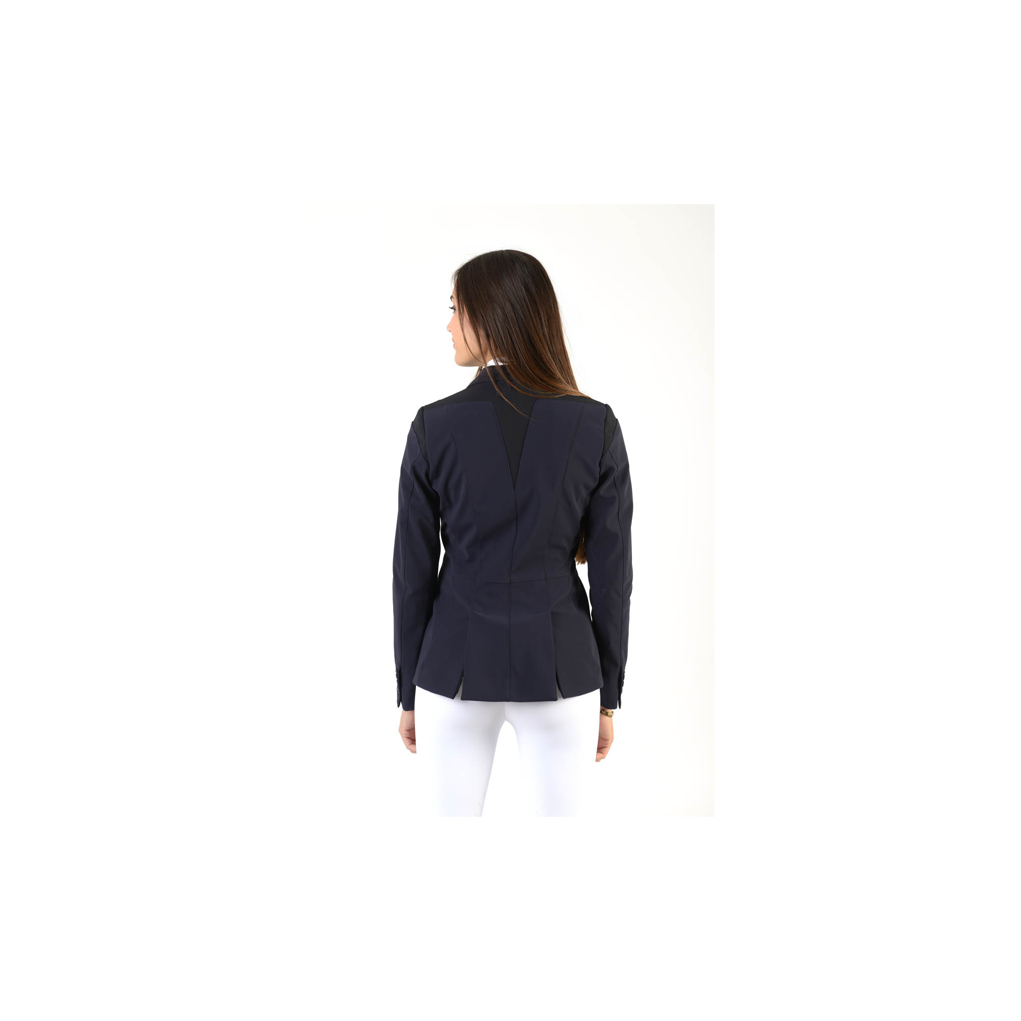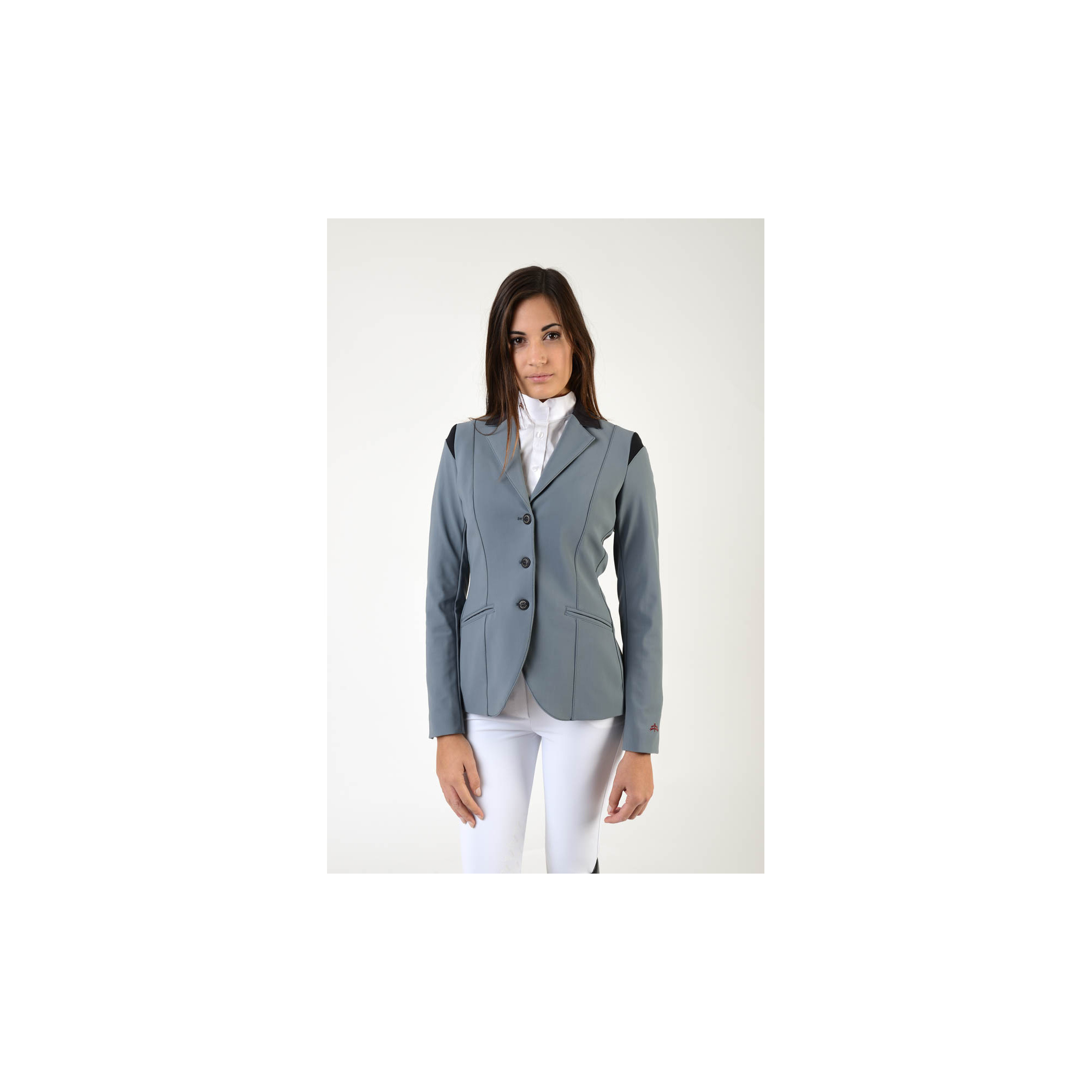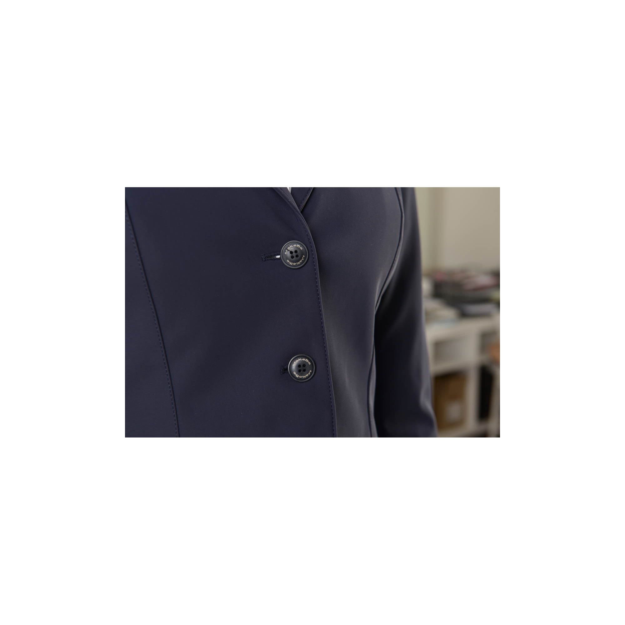 Extrem eleganter Turnierfrack. Er wurde aus einem hochwertigen technischen Material hergestellt. Bequem und atmungsaktiv. Der taillierte Schnitt betont schön die Figur und schränkt die Bewegung nicht ein. Er wird mit drei Knöpfen zugemacht. Der Frack ist mit einem dezenten Makebe-Logo am Satinkragen verziert.
