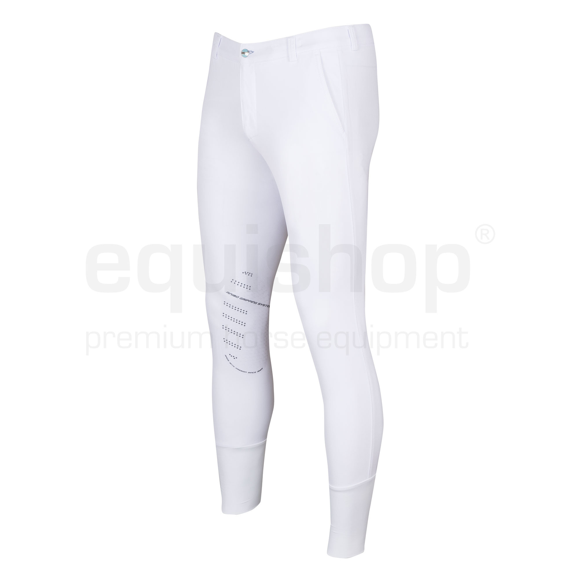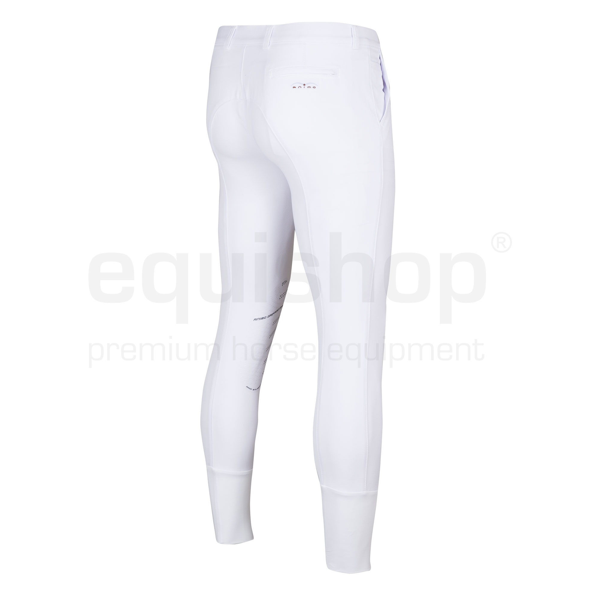 Die innovative AGS-Technologie, dank der die Animo-Reithose sehr haltbar ist, hat einen besseren Halt, verstärkten Besatz an den Knien und sorgt für eine perfekte Stabilisierung im Sattel. Das Modell Marlon hat zudem ein elastisches Finish an den Hosenbeinen. Die Hose hat ein gesticktes Animo-Logo auf der Gesäßtasche.