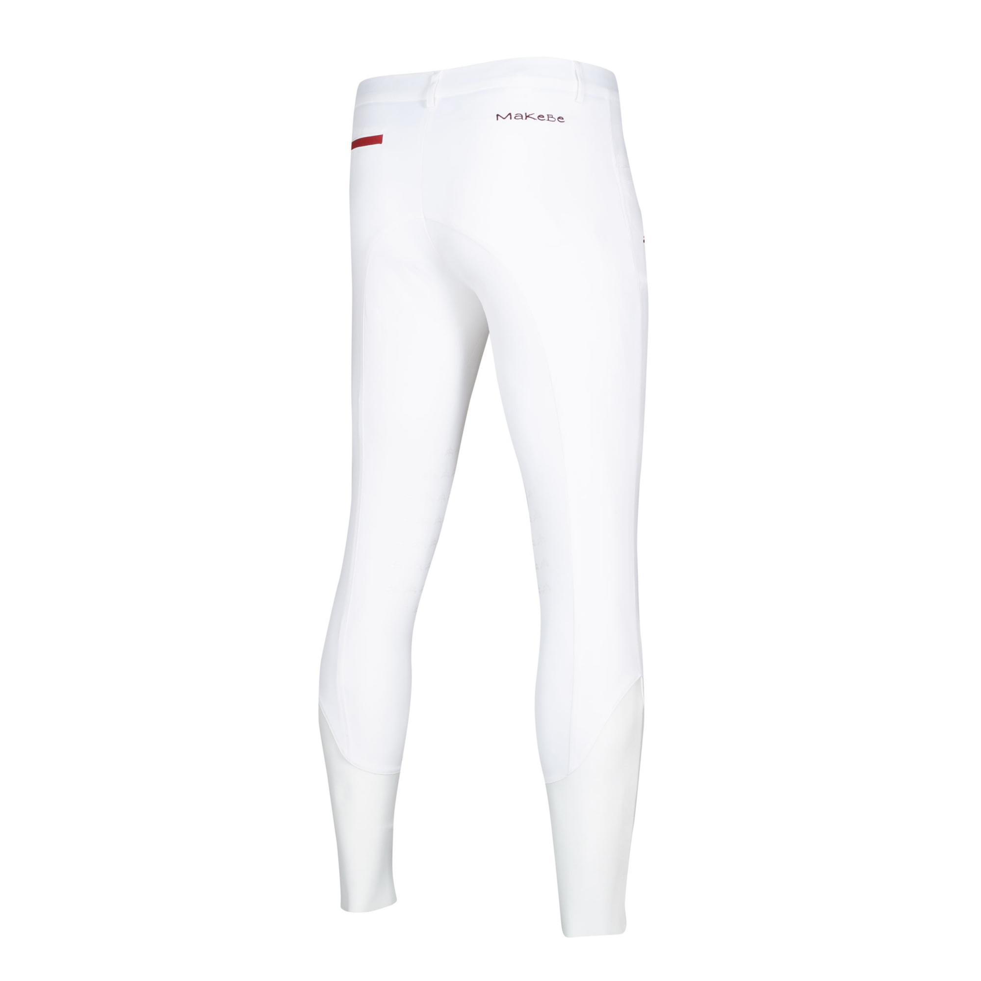 Herrenreithose mit Silikon-Kniebesatz. Sie wurde aus dem hochwertigsten flexiblen Material hergestellt. Bequem und atmungsaktiv. Die Hosenbeine sind mit einem elastischen Einsatz versehen, der eine perfekte Anpassung garantiert. Die Reithose ist mit der Makebe Aufschrift verziert.