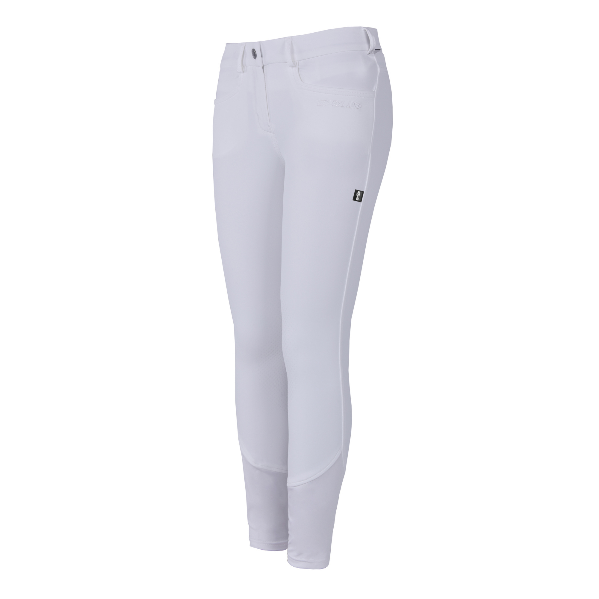 Im unteren Teil der Wade wurden Bündchen hinzugefügt, um den Komfort zu erhöhen. Die Reithose hat zwei Fronttaschen und Gürtelschlaufen. Unter der linken Tasche befindet sich eine dekorative Stickerei mit dem Kingsland-Logo.