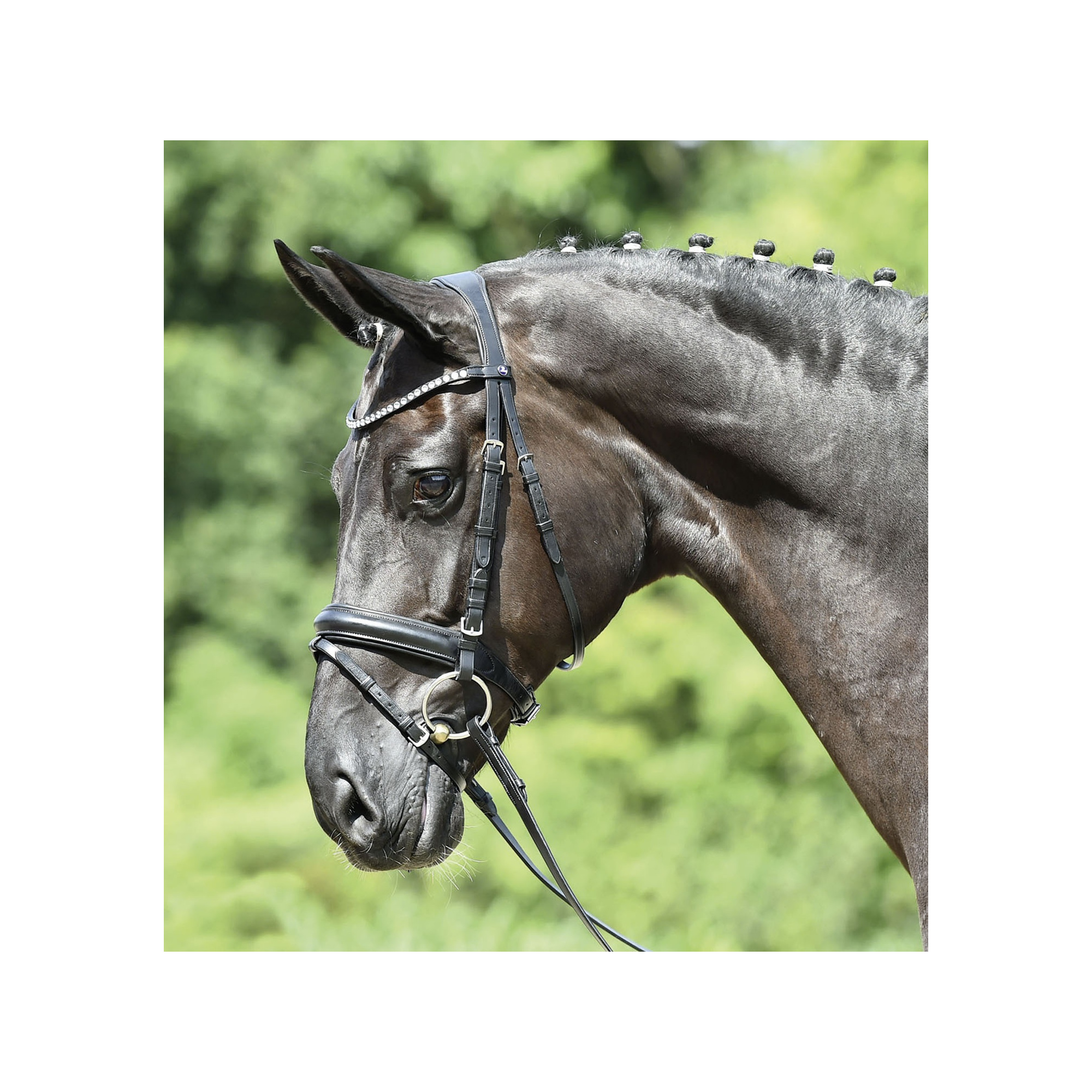 Beautiful functional bridle with English noseband, made of the best Italian leather. A wide, softly lined occiput strap of anatomical shape, which provides optimal distribution of pressure. The noseband is attached symmetrically on both sides. A trendy, droopy headband is decorated with shiny artificial crystals. Throatlatch is regulated on both sides. Straps and bit hooks as well as fitting are made of stainless steel.