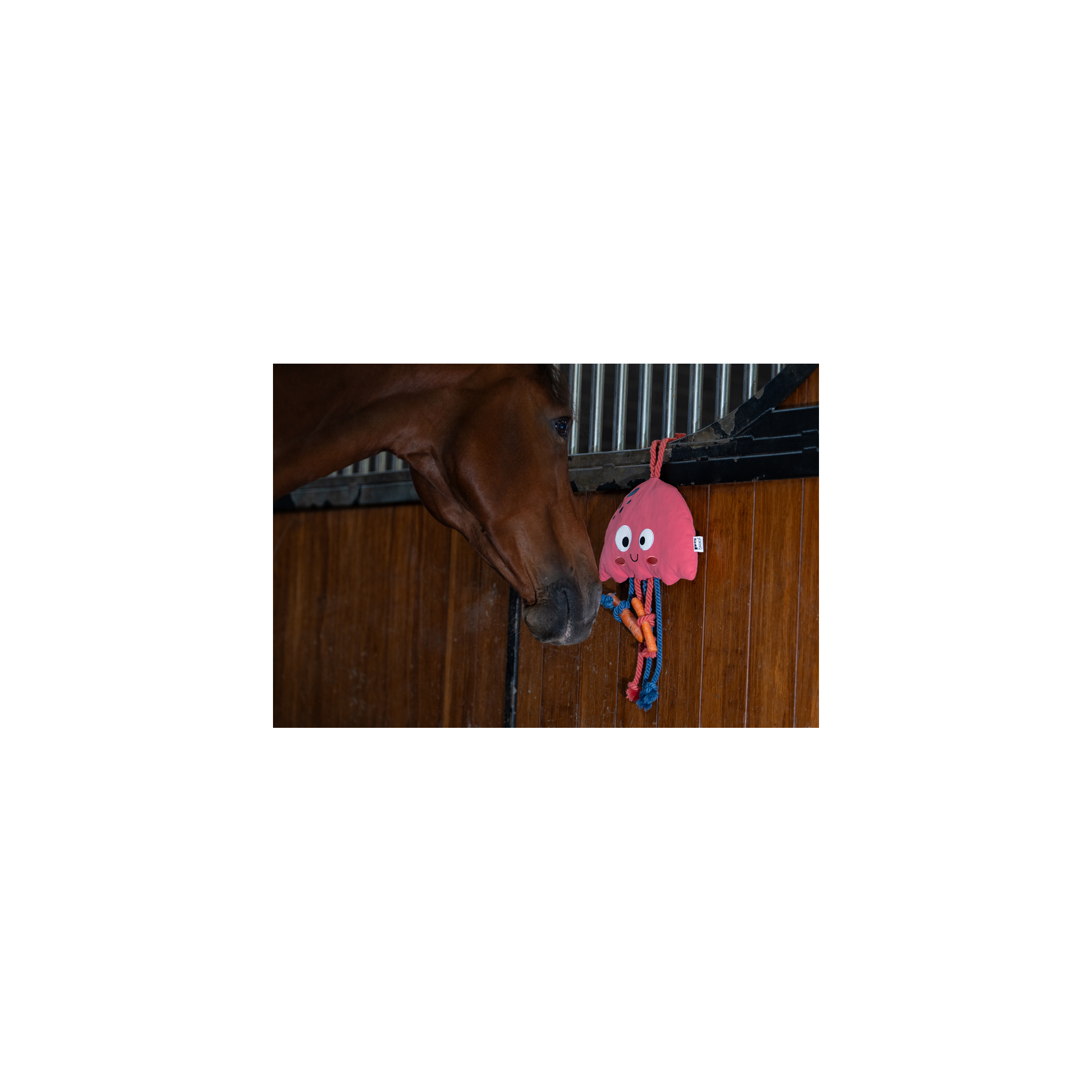 The horse stable toy in the shape of a jellyfish is a creative way to provide entertainment for your horse. Made from durable material, it combines fun design and functionality. The coral and blue colors reflect spring and summer times, adding a cheerful touch to the stable. Perfect for hanging in the stall, it encourages the horse to play and stay active.