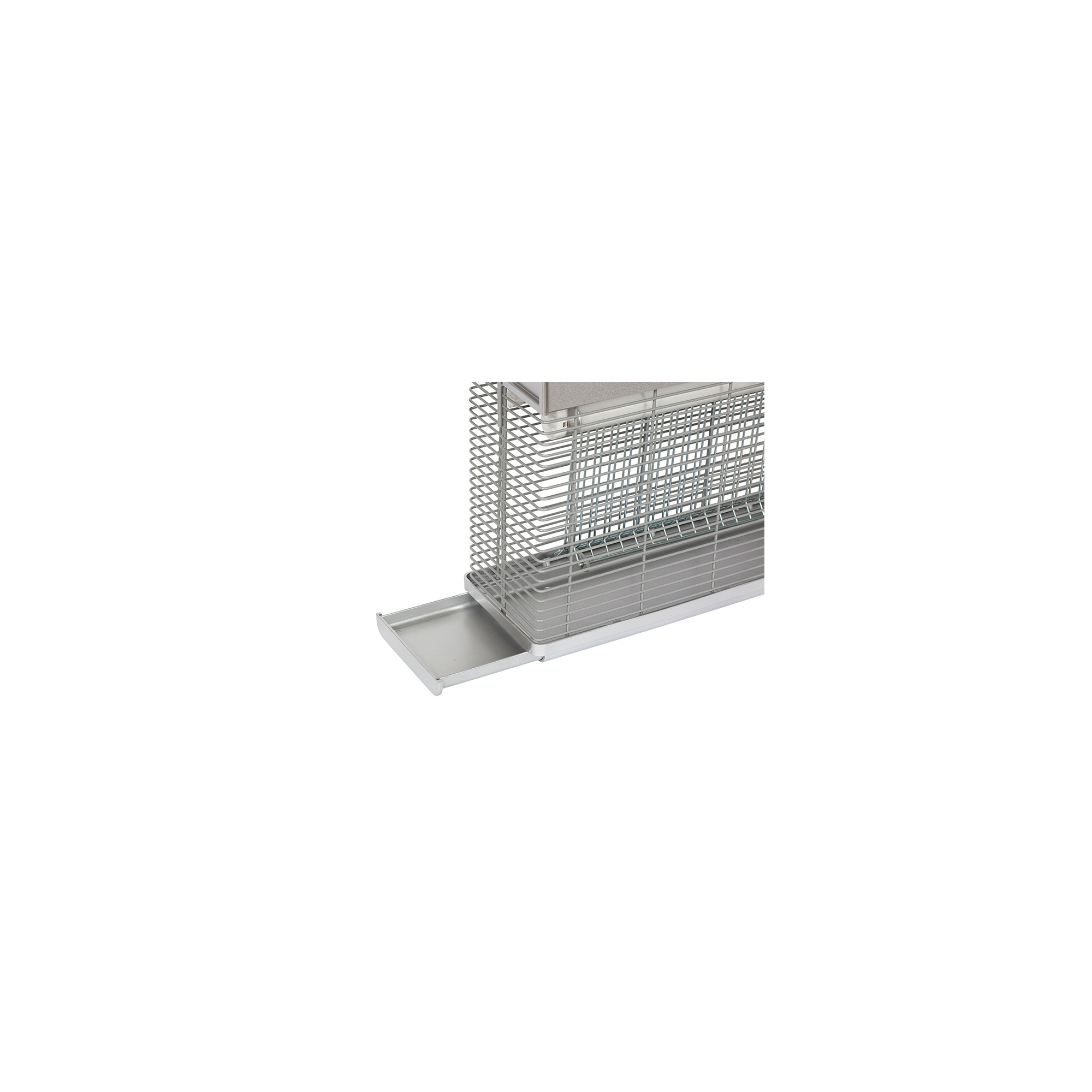 The insects are lured into a trap by the UV-A light emitted by fluorescent tubes. The electric net inside the lamp has a power of 2200V and effectively exterminates insects. Underneath the net, there is a container that also works as the bottom of the lamp. This design allows for hassle-free cleaning.
