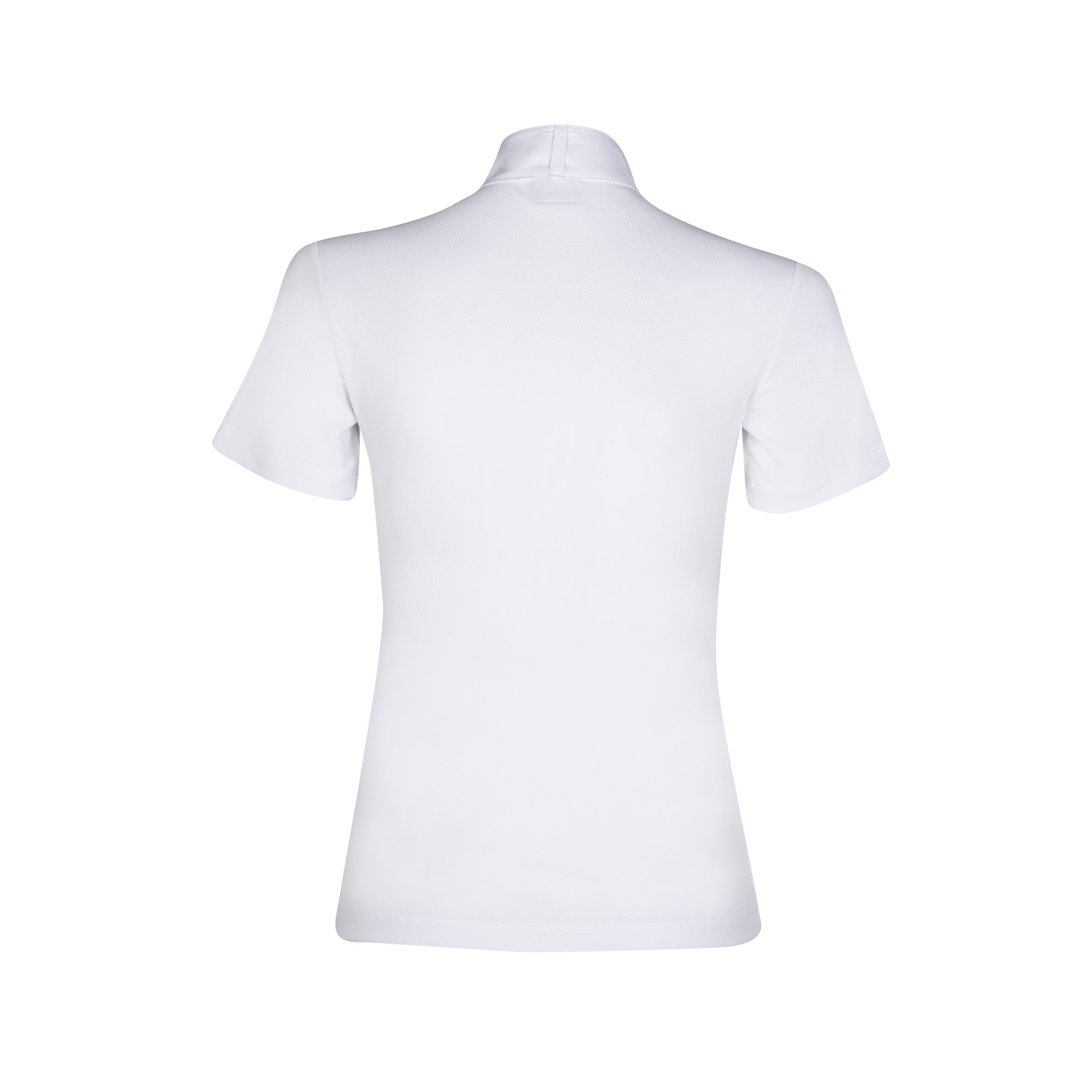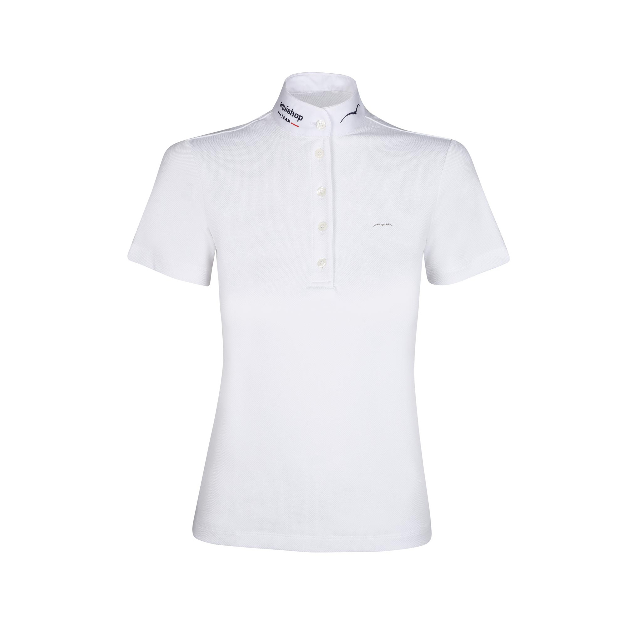 A beautiful women's show polo shirt with a stand-up collar made of light and close-fit technical material. Its main advantage is quick drainage of moisture to the outside and providing proper airflow, which is why the shirt is comfortable even on hot days. It has five buttons. There is an Animo's logo on the chest and stand-up collar, and the Equishop Team's logo on the other side of the collar.