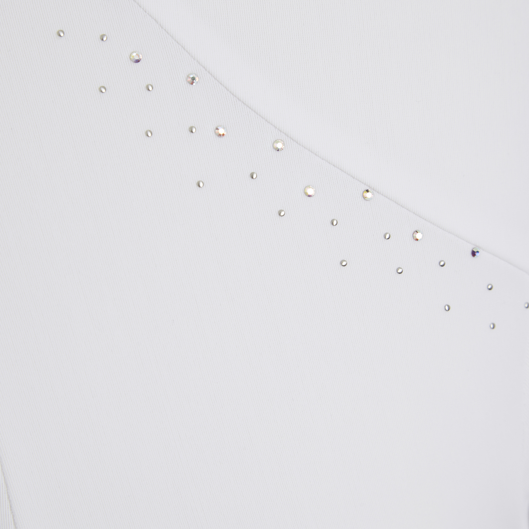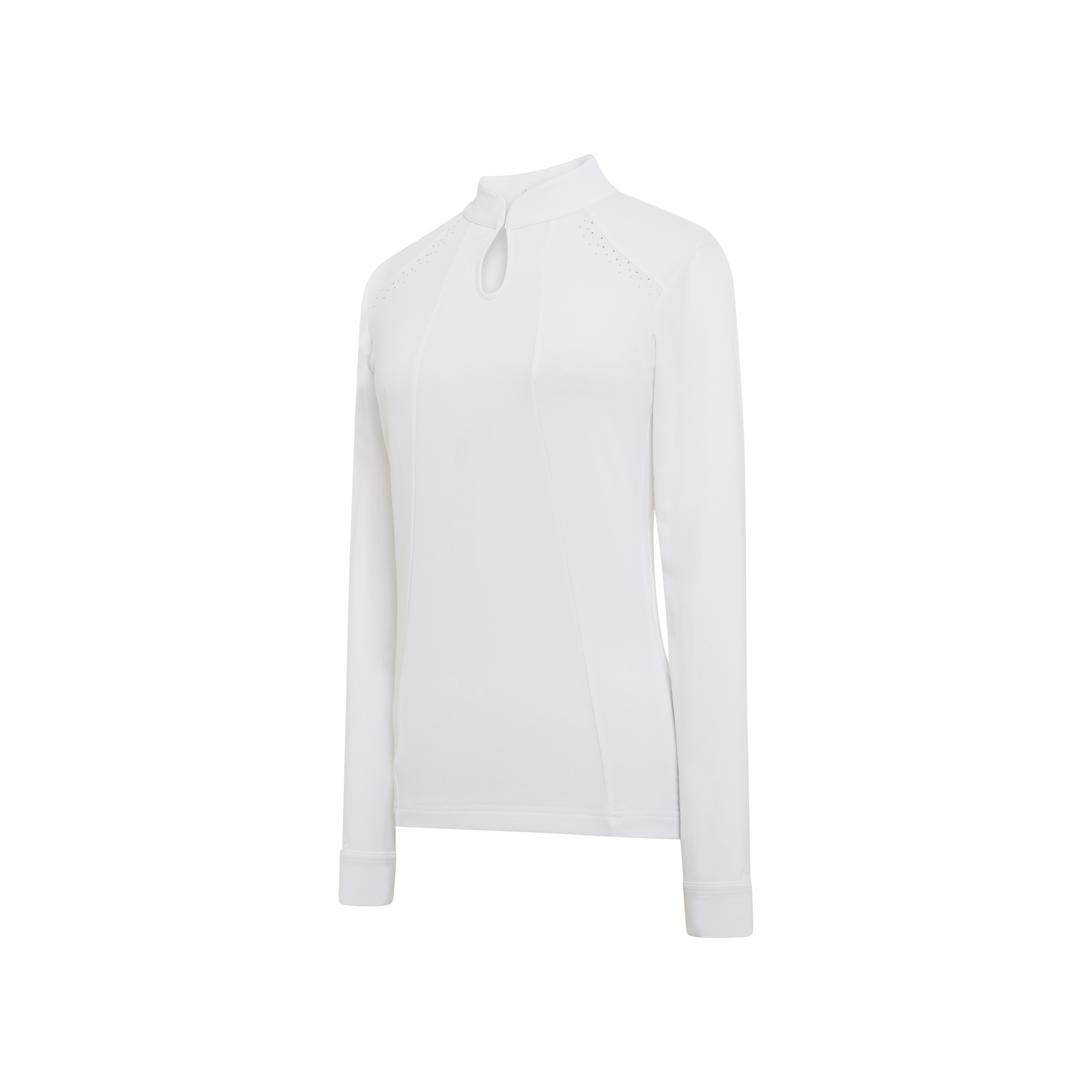 The Elvira women's long-sleeve competition shirt is composed of two French fabrics: a technical four-way stretch fabric on the front and a lurex fabric on the back and the sides. The material guarantees freedom of movement and maximum comfort - it is breathable and wicks away excess moisture. The shirt draws attention with its beautiful details: a teardrop-shaped pattern on the front with a hook-and-loop closure and Swarovski crystals that subtly decorate the collar. The shirt is machine washable at 30 degrees. This is a high-quality model that will ensure you look impeccable during the equestrian event.
