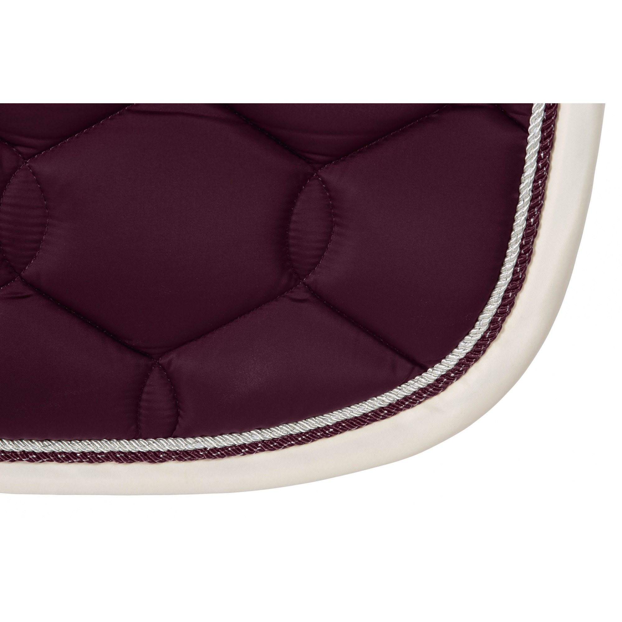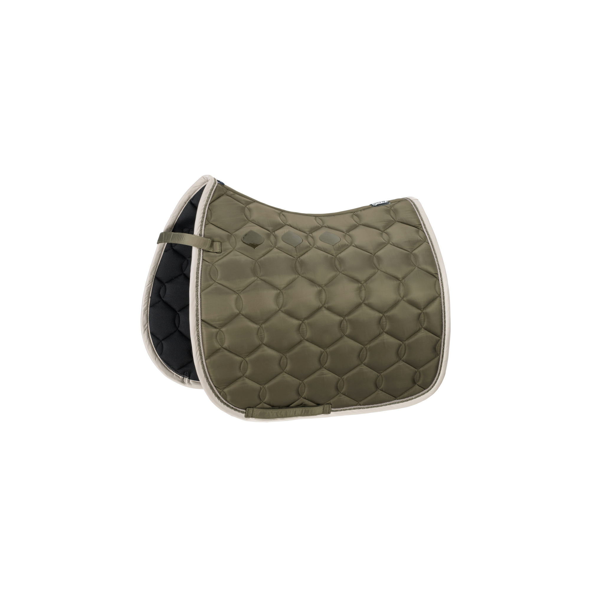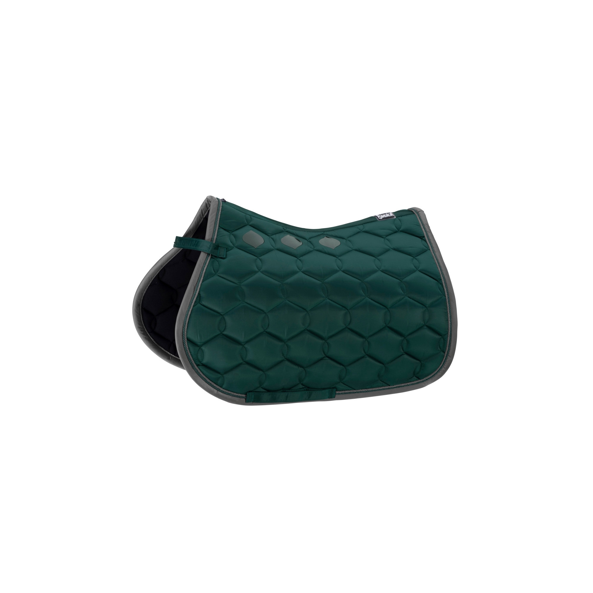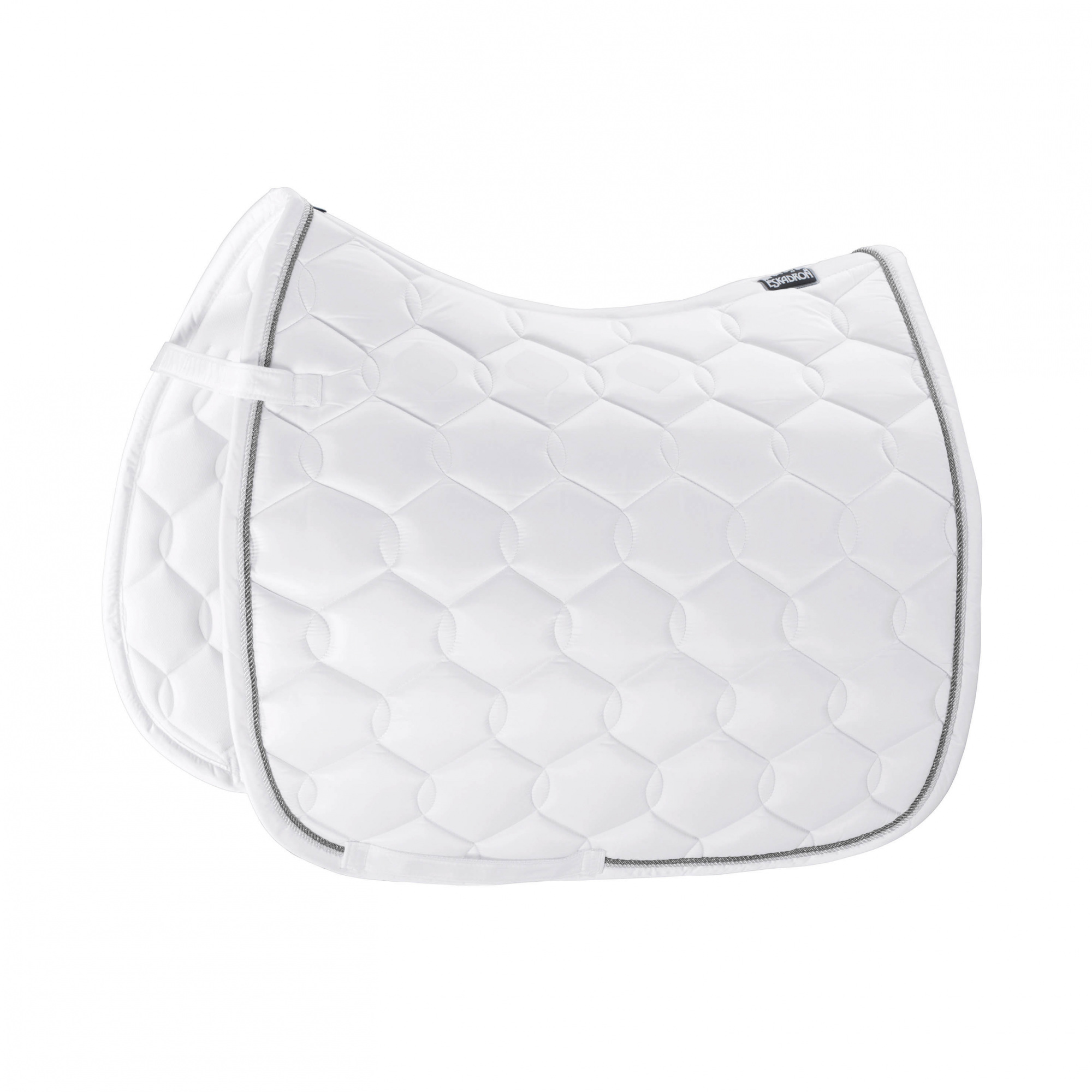 A Glossy Wave Contrast nyeregalátét tartós és fényes anyagból készült. Anatómiai formája van, ennek köszönhetően jobban illeszkedik a ló hátára. Fényes szegély és dupla fonott zsinórok díszítik. Belül lélegző hálós anyaggal bélelt. A ló hátoldala felől szilikon betétek lettek behelyezve, amelyek megakadályozzák a csúszást és egyben javítják a tapadást is. A hátoldalon, a gerinc részén Eskadron logóval ellátott embléma van felvarrva. Sok színben kapható.