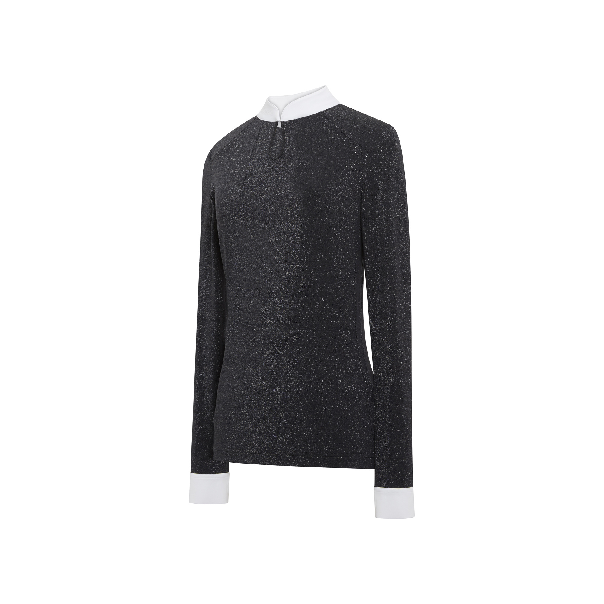 Az Elvira női hosszú ujjú versenypóló két francia szövetből áll: egy 4 irányban nyúló, technikai sztreccs anyagból az elején és egy lurex anyagból a hátán és az oldalán. Anyaga mozgásszabadságot és teljes kényelmet biztosít - légáteresztő illetve elvezeti a felesleges nedvességet. A póló gyönyörűen kidolgozott részletekkel hívja fel magára a figyelmet: elől könnycsepp alakú mintában végződő gallérral és Swarovski kristályokkal, amelyek finoman díszítik a kulcscsont öltésvonalát. A póló mosógépben 30 fokon mosható. Ez egy kiváló minőségű modell, amely professzionális megjelenést és kifogástalan összképet biztosít a verseny során.
