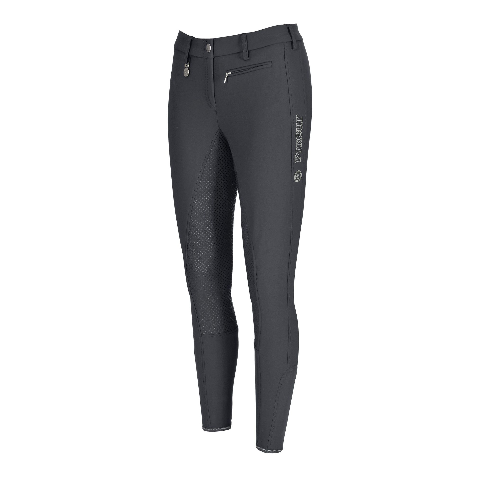 A bal lábon egy dísszel van ellátva, márkalogó formájában és az övbujtató hurok mellett fém kitűző, szintén Pikeur logóval. Cipzáros zsebük van.