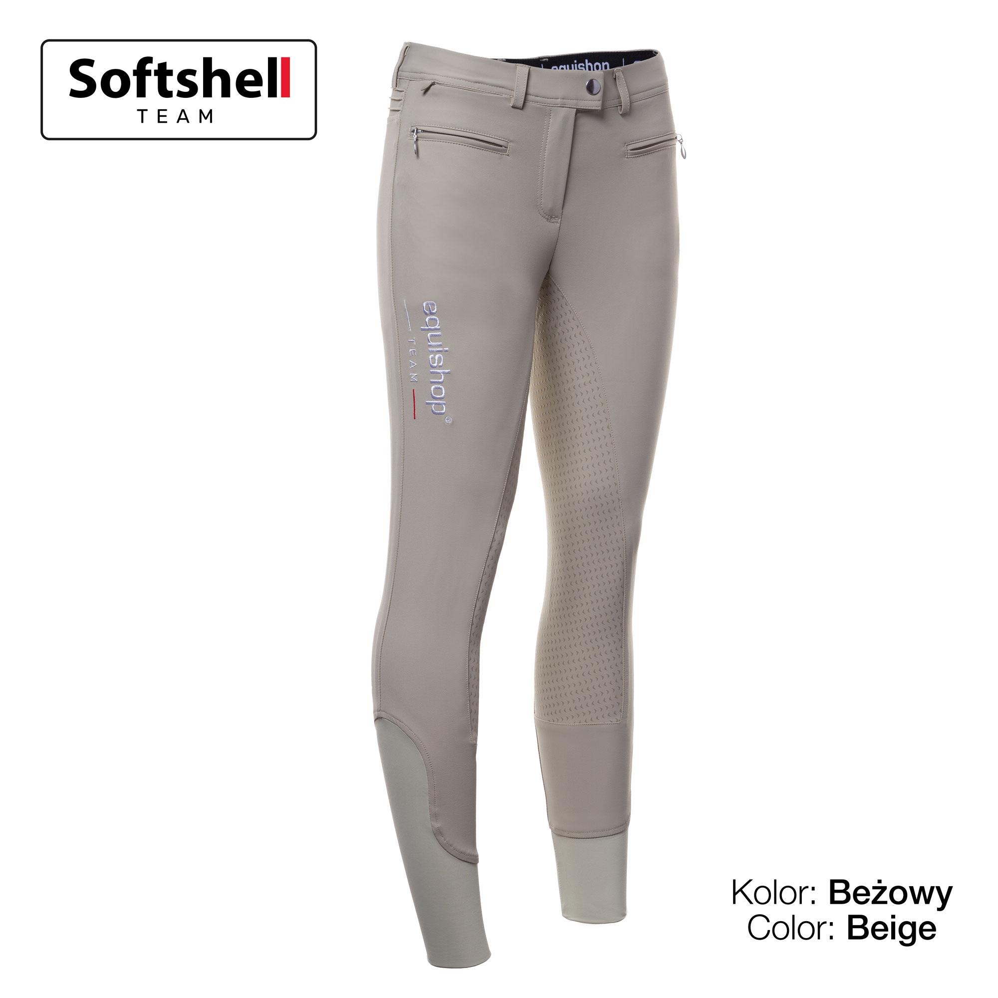A jobb lábszáron egy Equishop Team logó található. A nadrág az elején három praktikus cipzáras zsebbel rendelkezik.