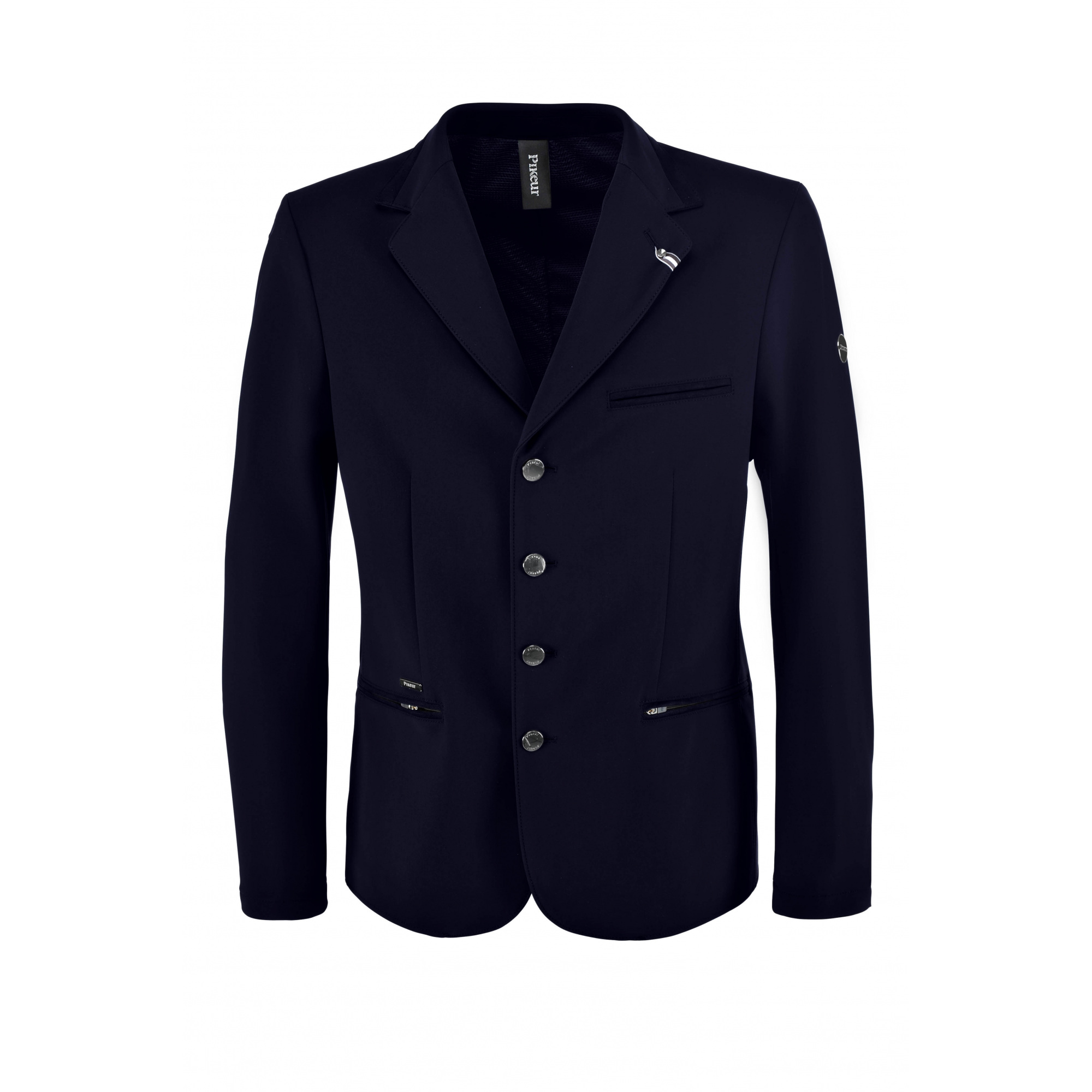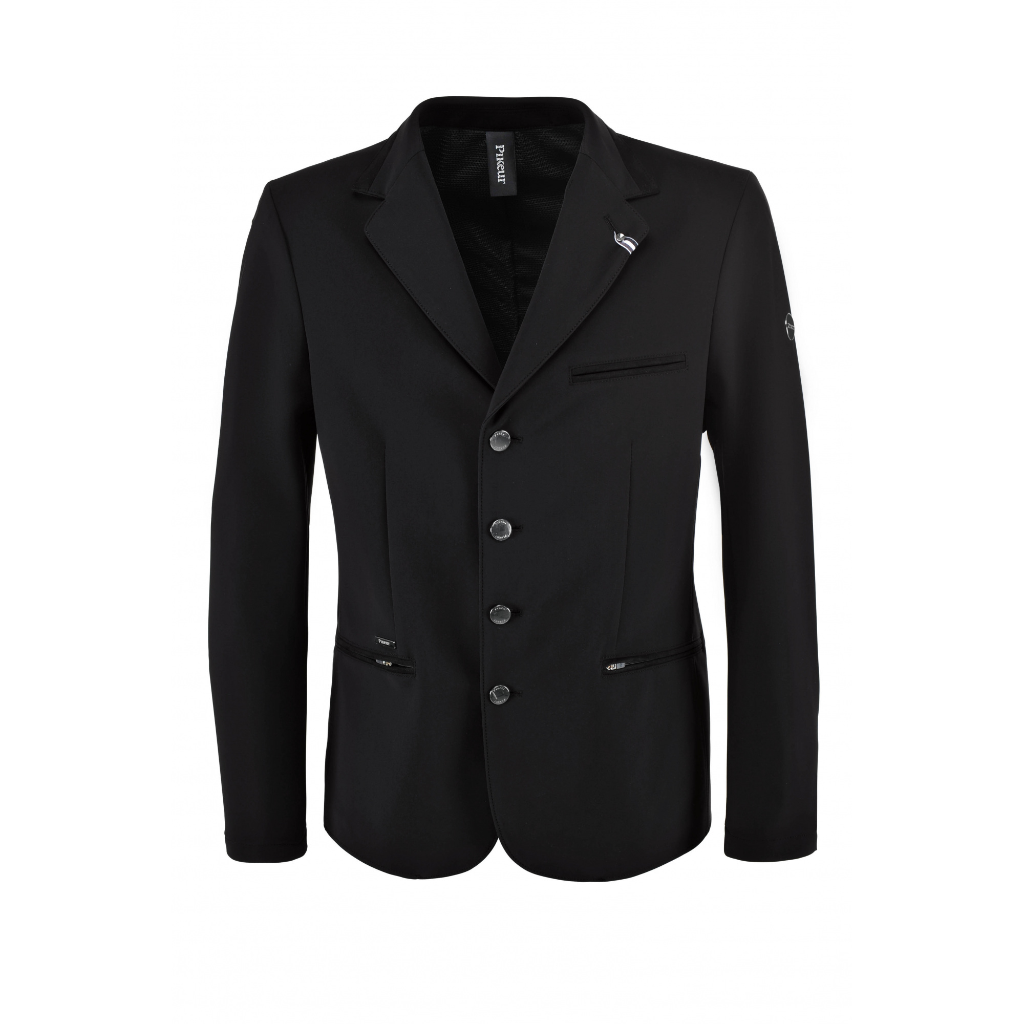 Férfi Pikeur versenyzakó lovagláshoz. Kiváló minőségű anyagból készült, amely rugalmas, lélegző és kényelmes a bőr számára. A zakó teljes mozgásszabadságot illetve magas szintű személyes kényelmet biztosít. Ezenkívül két cipzáras zsebbel rendelkezik illetve egy van a mellkason, valamint egy négy díszgombos rögzítési megoldással szintén fel van felszerelve. A zakó nagyon szépen illeszkedik a sziluettre és a nyeregben is csodásan mutat, a zseb fölé és a bal vállára pedig Pikeur logóval ellátott dekoratív plakettek kerültek.