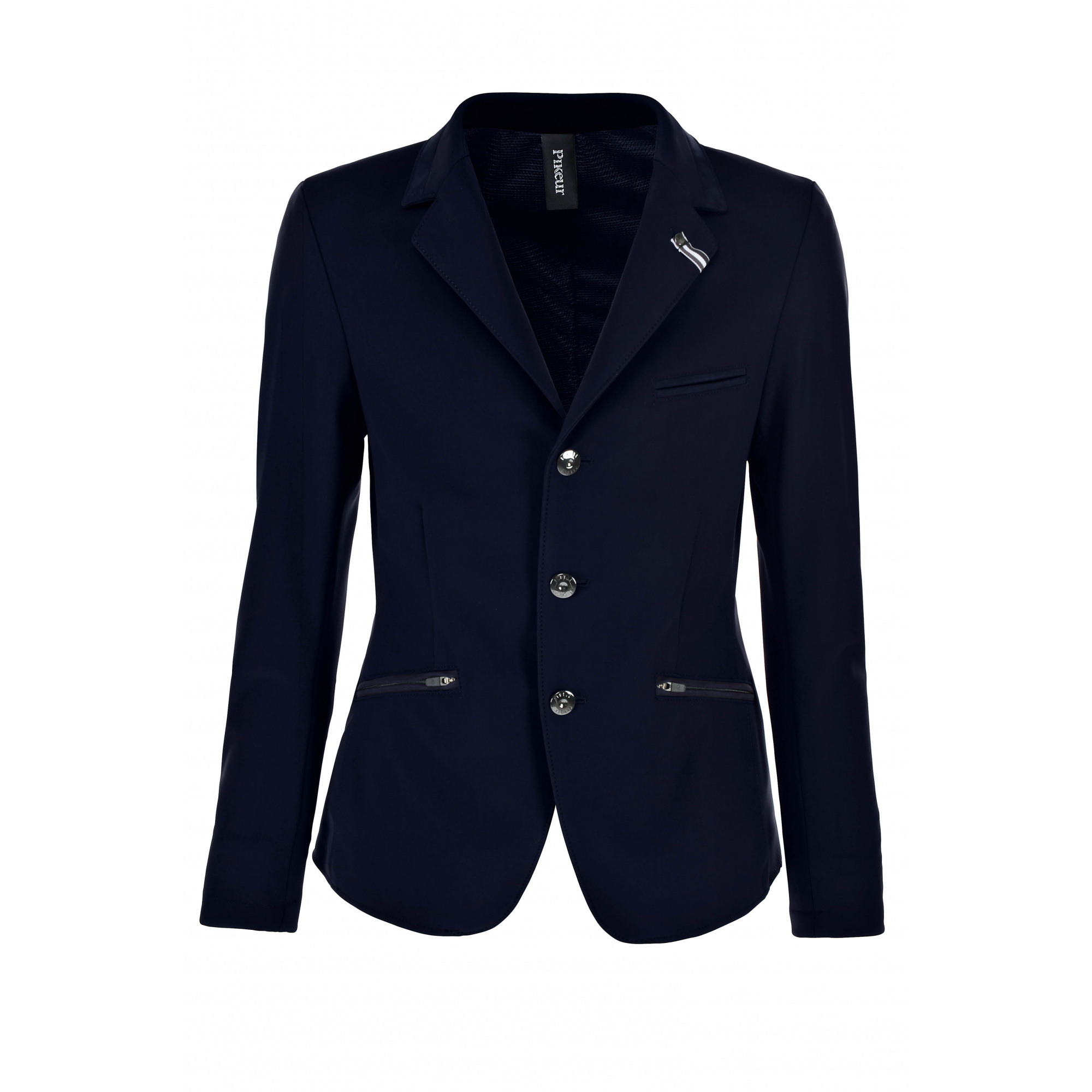 Pikeur fiúcska versenyzakó. Kiváló minőségű anyagból készült, amelyet nagy légáteresztő képesség, rugalmasság és a kényelem jellemez. Teljes mozgásszabadságot és magas szintű személyes kényelmet biztosít. Ezen kívül a zakó három gombos rögzítési lehetőséggel illetve két cipzáras zsebbel és egy mellzsebbel van felszerelve a zsebkendő számára. A zakó gallérjára egy kis plakett került fel a Pikeur márka logójával.
