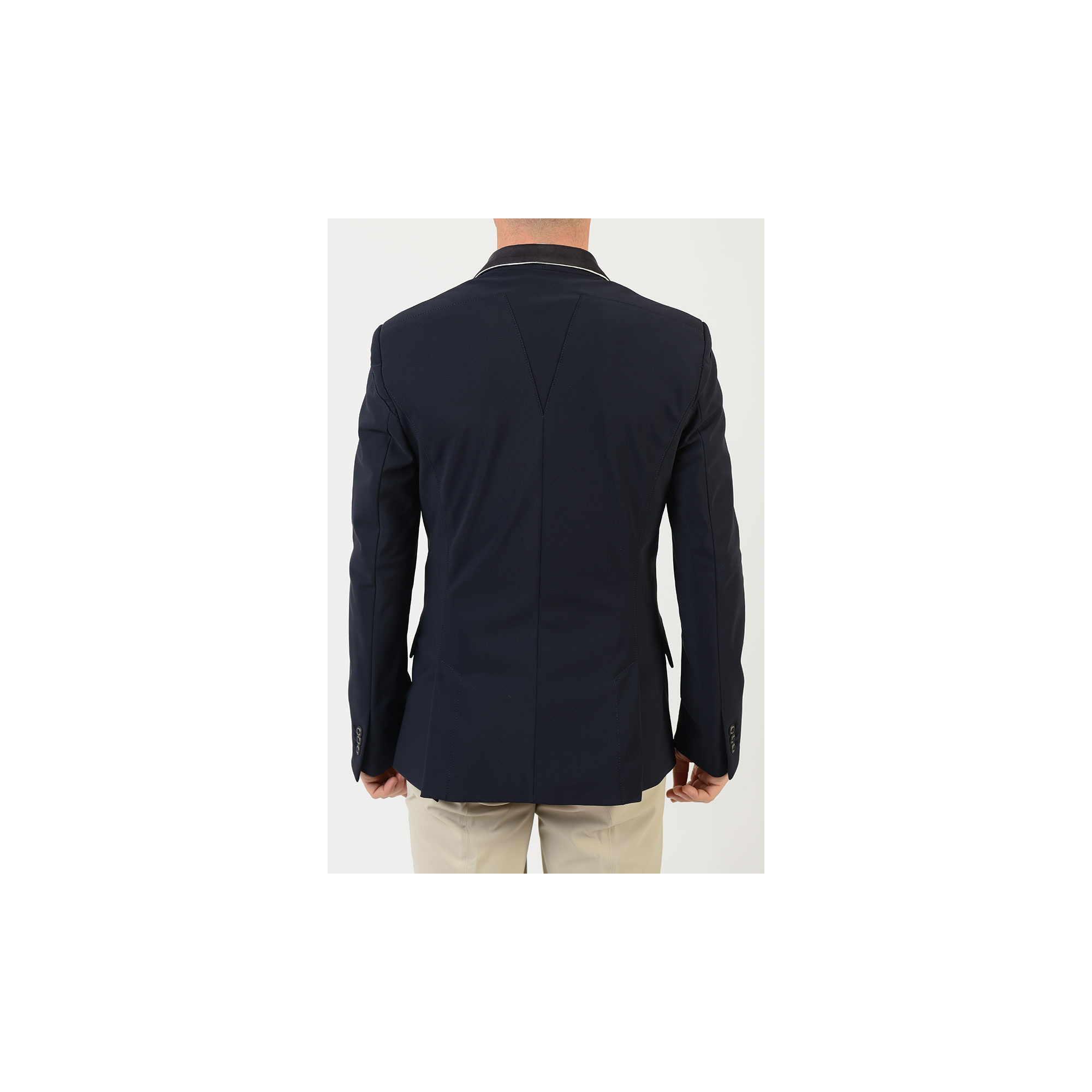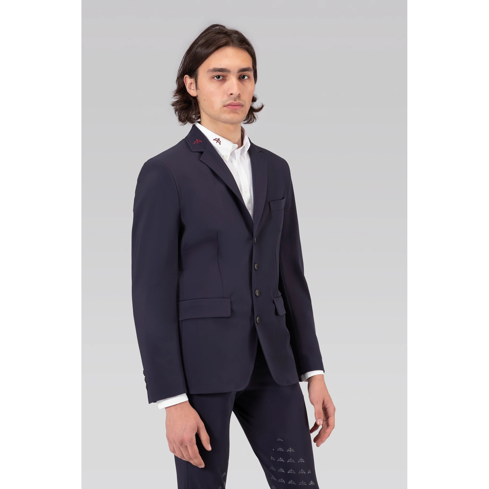 Elegancki męski fraczek konkursowy. Wykonany z najwyższej jakości materiału. Komfortowy i oddychający. Lekko taliowany krój wysmukla sylwetkę, nie krępuje ruchów. Zapinany na cztery guziki. Fraczek ozdobiony logo Makebe na mankiecie i kołnierzu z lamówką.