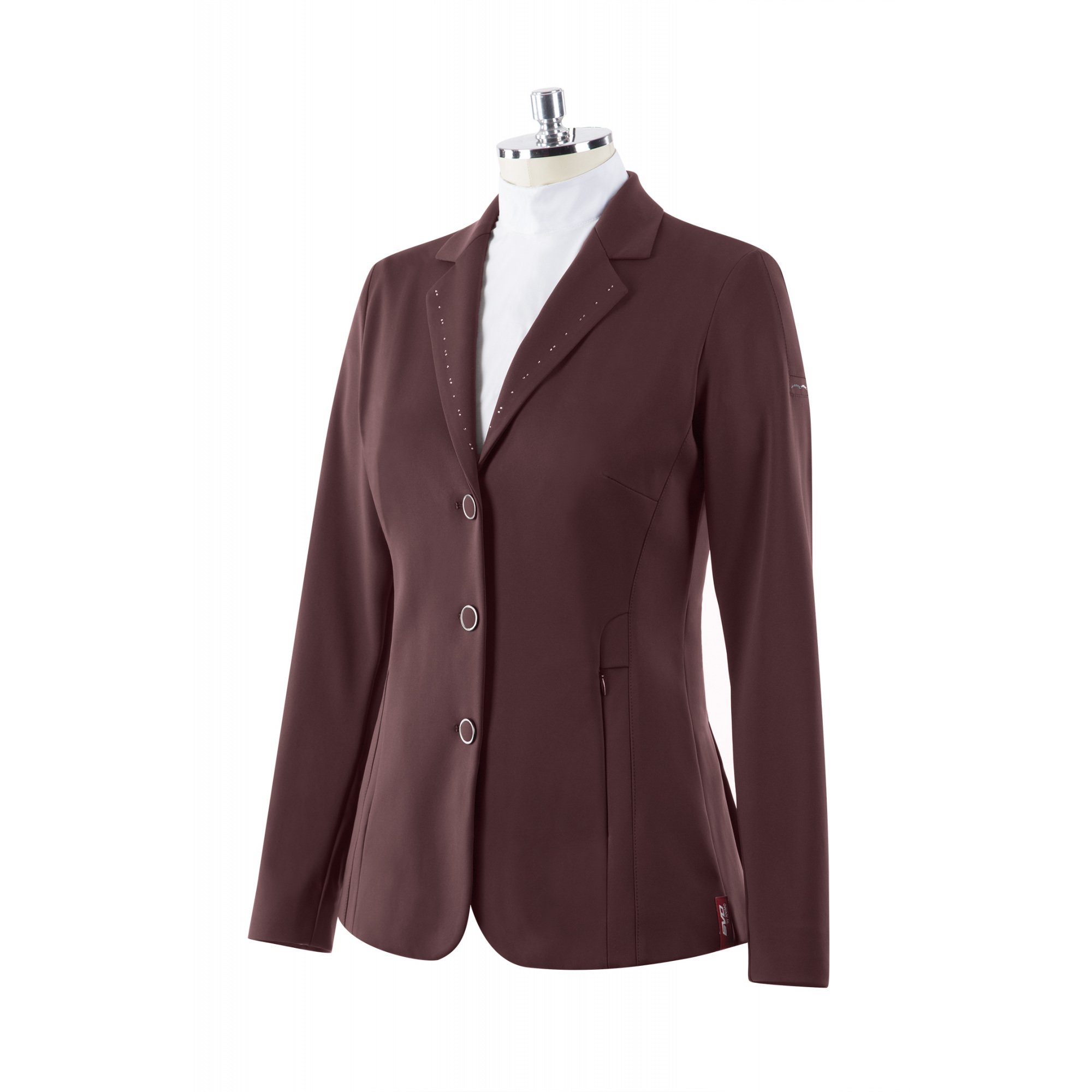 A versenyzakó gallérhoz tartozó részein apró, csillogó kristályok vannak. A gombok a zakóval megegyező színűek, kontrasztos színű szegéllyel.