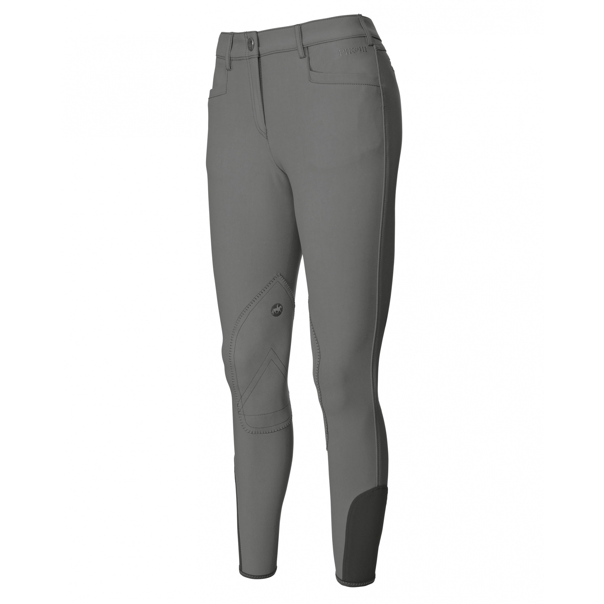 Elementem ozdobnym jest wyhaftowane logo marki Pikeur nad lewą kieszenią oraz nad prawym kolanem.