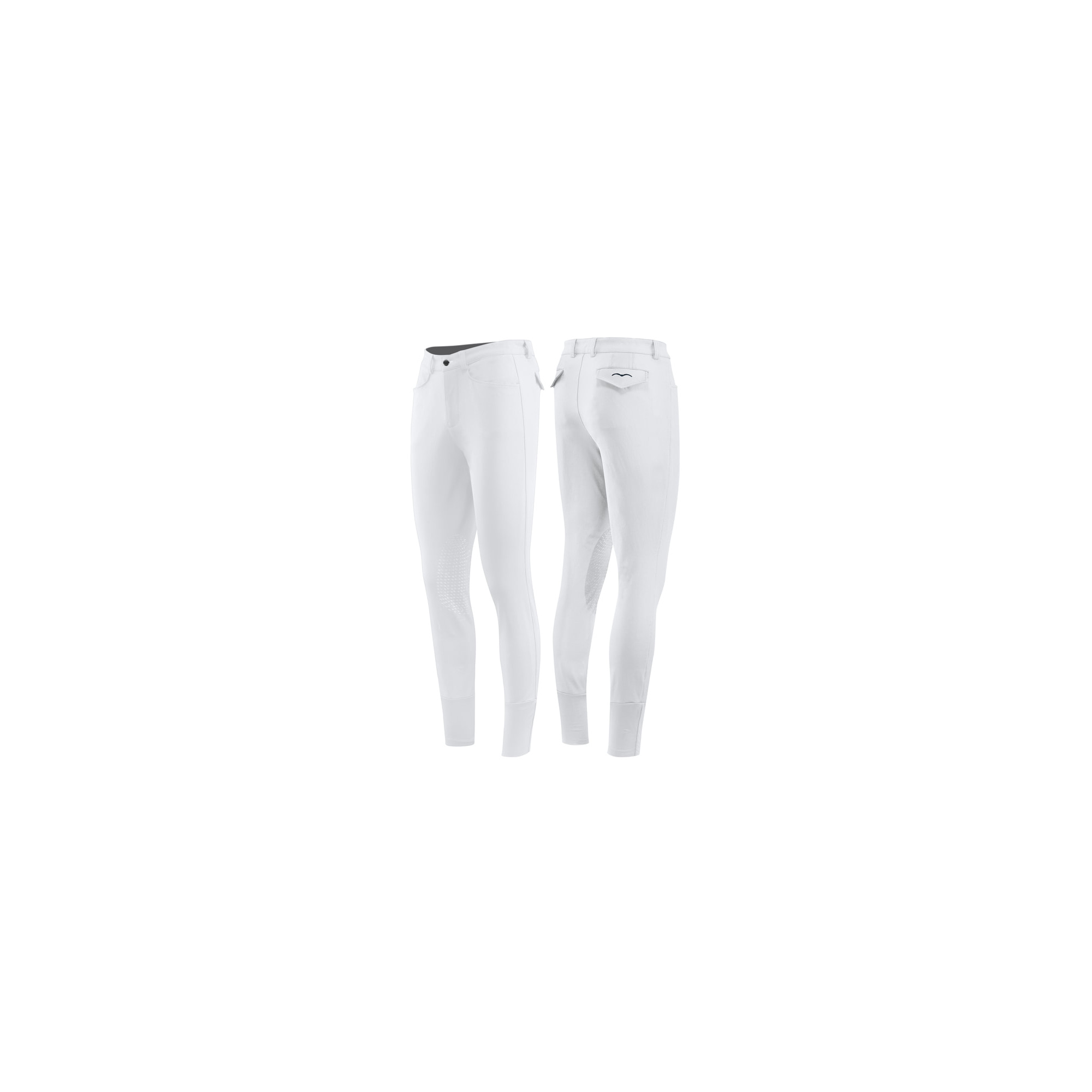 Męskie bryczesy jeździeckie firmy Animo, wykonano je z wysokiej jakości elastycznego materiału, który doskonale przepuszcza powietrze oraz jest bardzo przyjemny dla skóry. Dodatkowo bryczesy wyposażono w dwie kieszenie z przodu oraz dwie z tyłu z zamknięciem na klapy, w elastyczne ściągacze na zakończeniu nogawek i lej kolanowy wykonany z silikonu, który zapewnia dobrą przyczepność w siodle i ochronę kolan przed otarciami. Dekoracyjnie na zamknięciu kieszeni dodano logo firmy Animo.