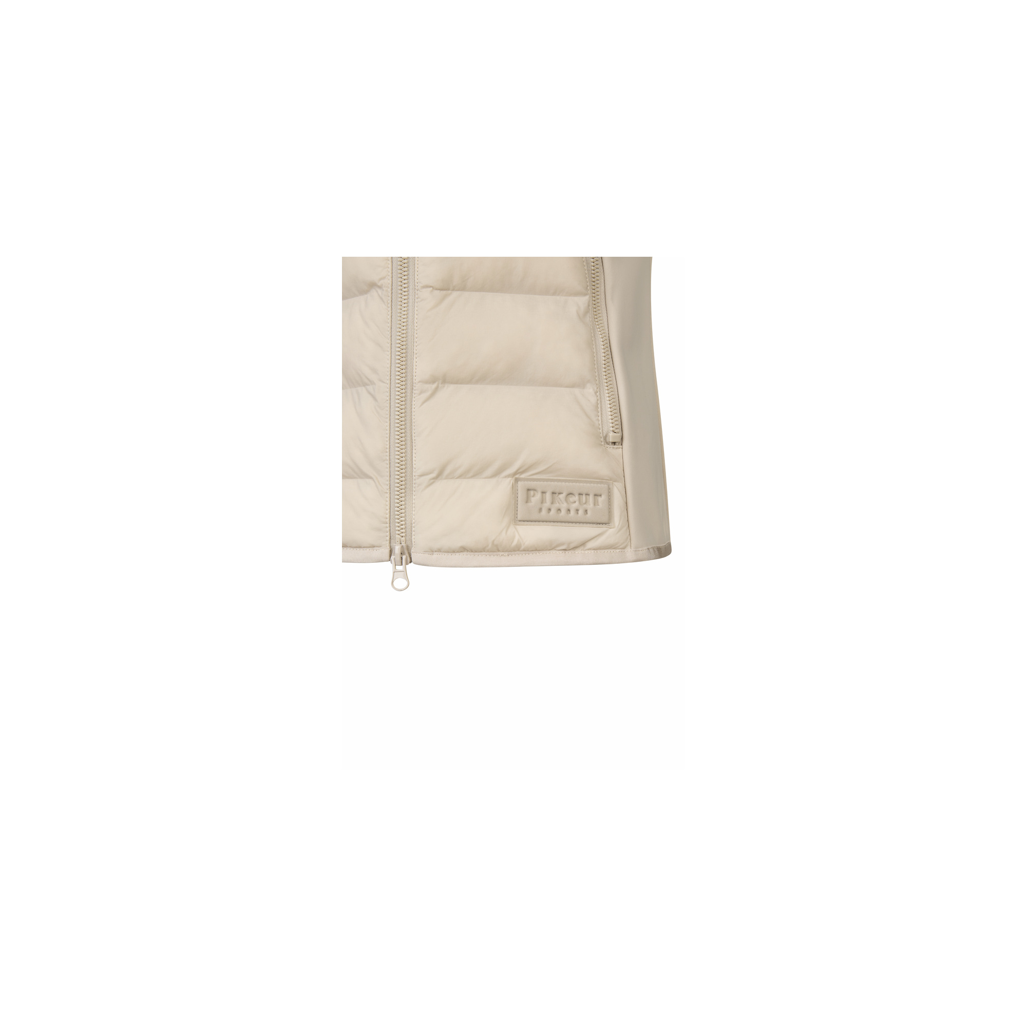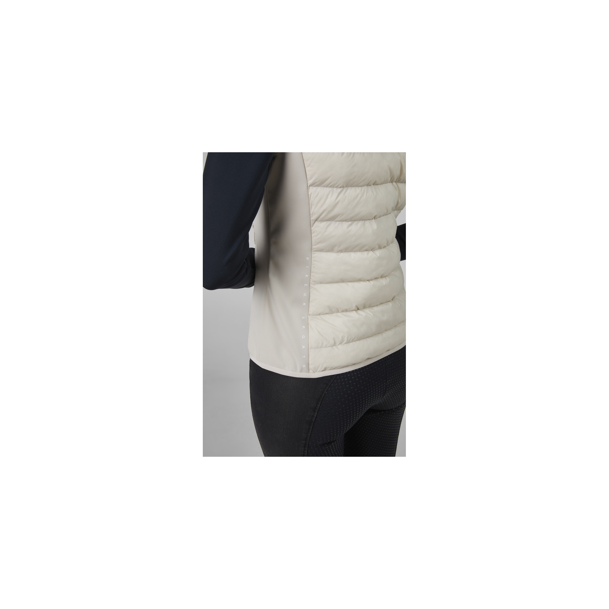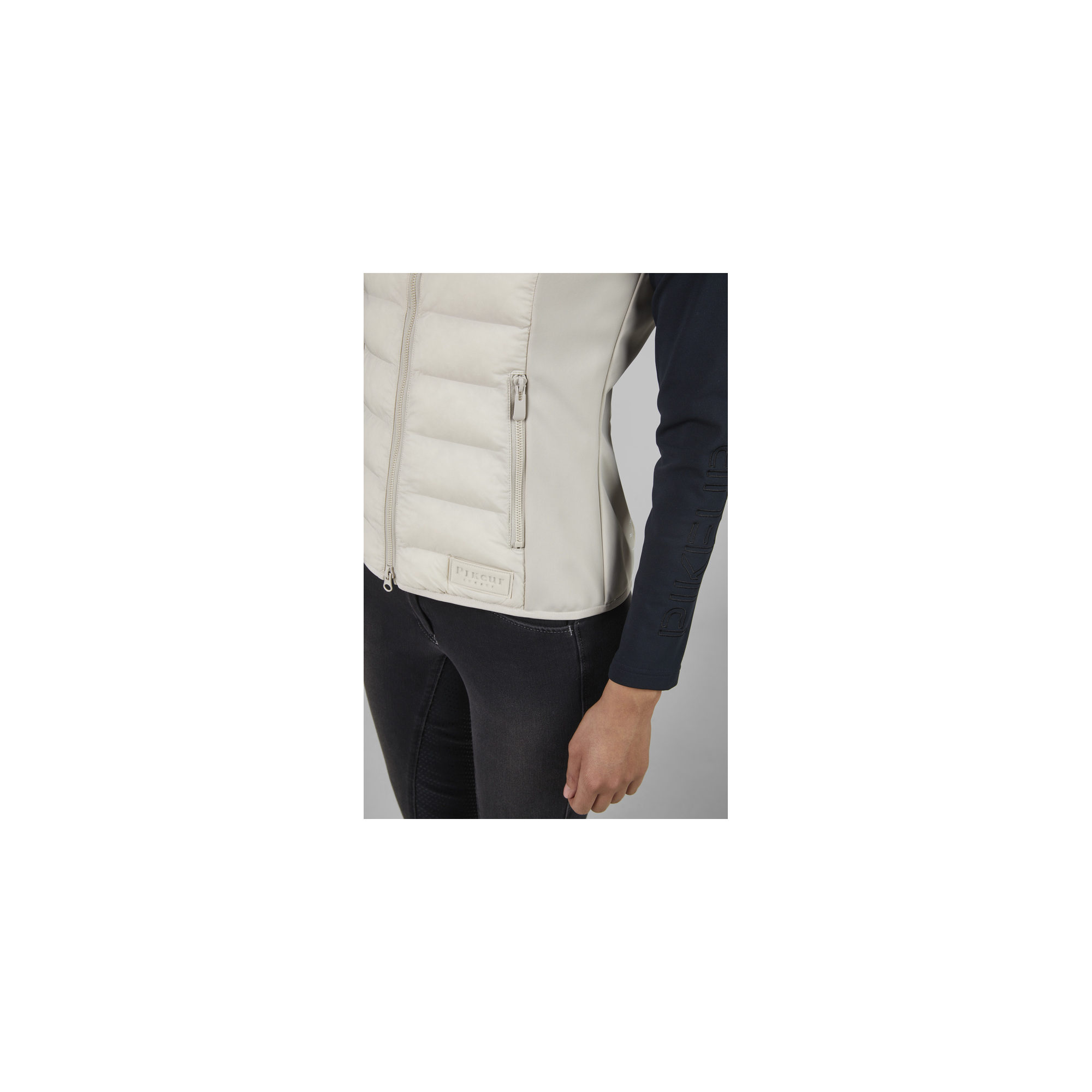 Puchowe logo Pikeur na dole i białe nadruki na ramieniu oraz bocznym szwie.