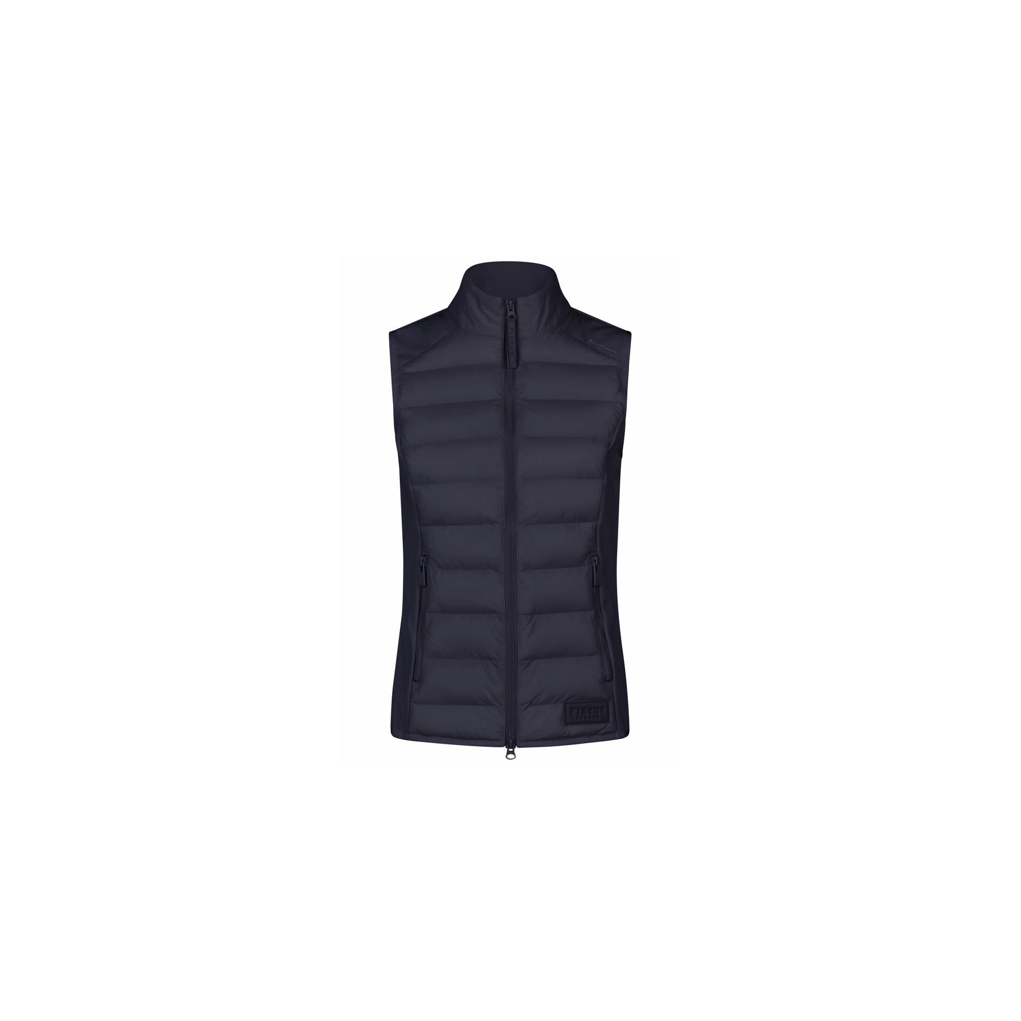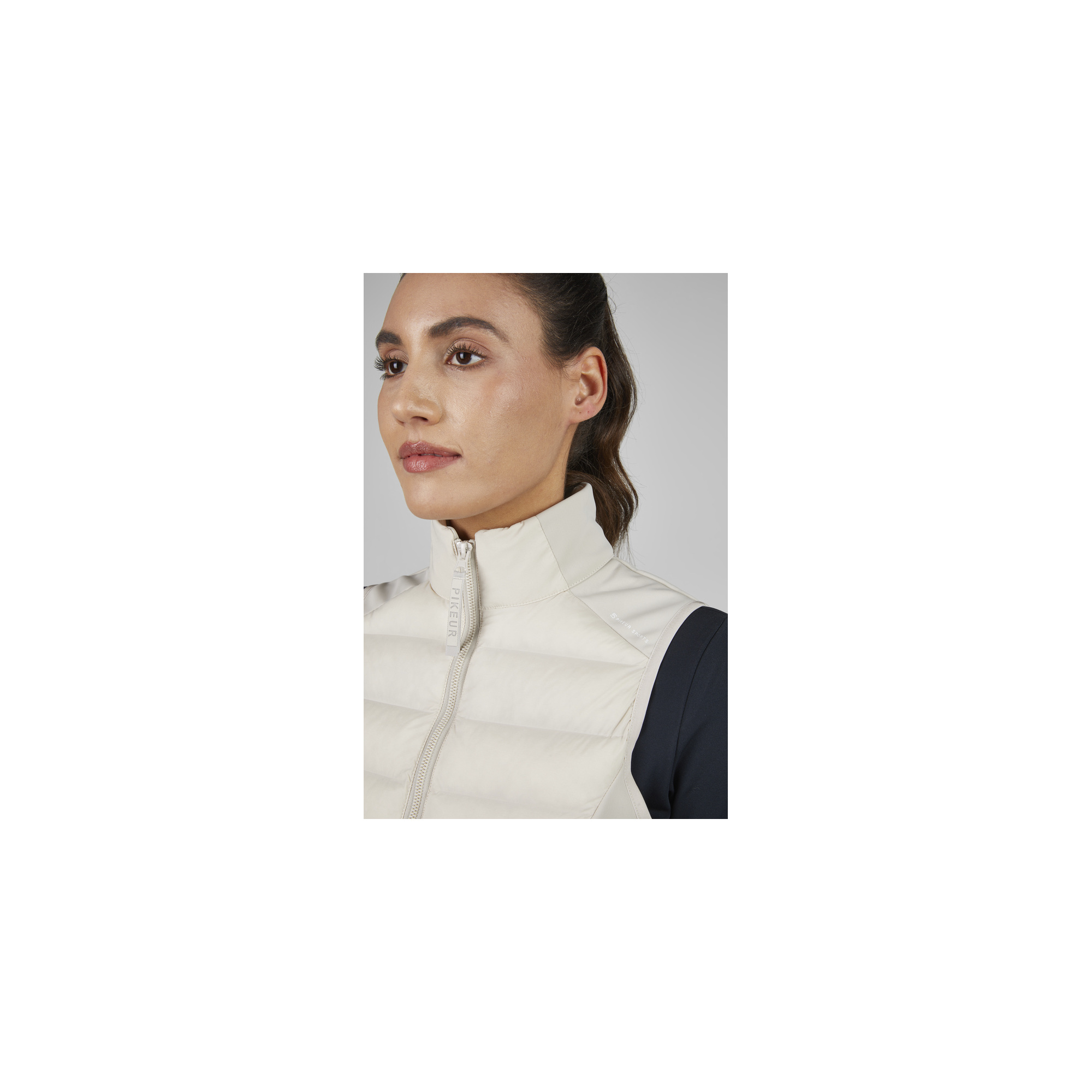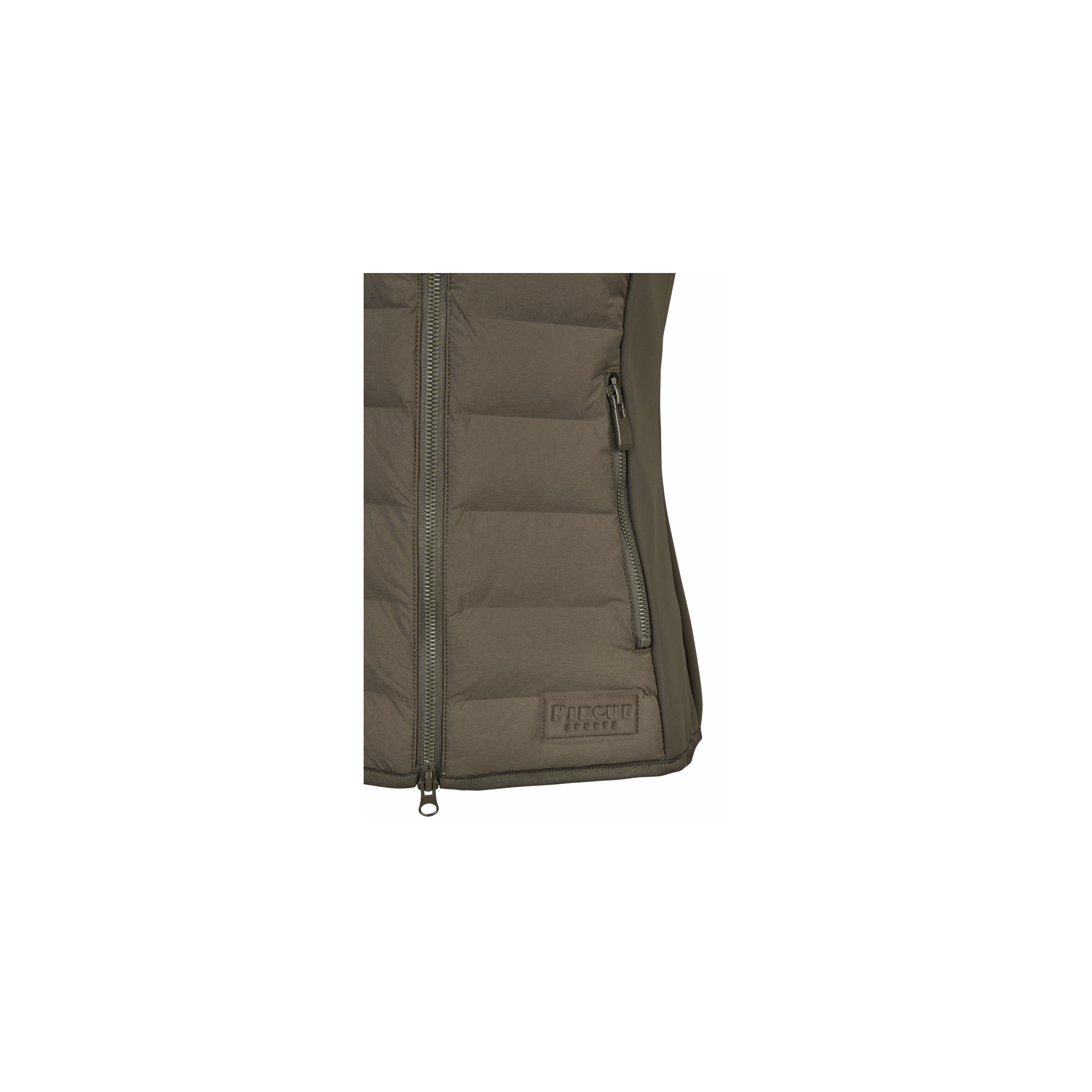 Puchowe logo Pikeur na dole i białe nadruki na ramieniu oraz bocznym szwie.