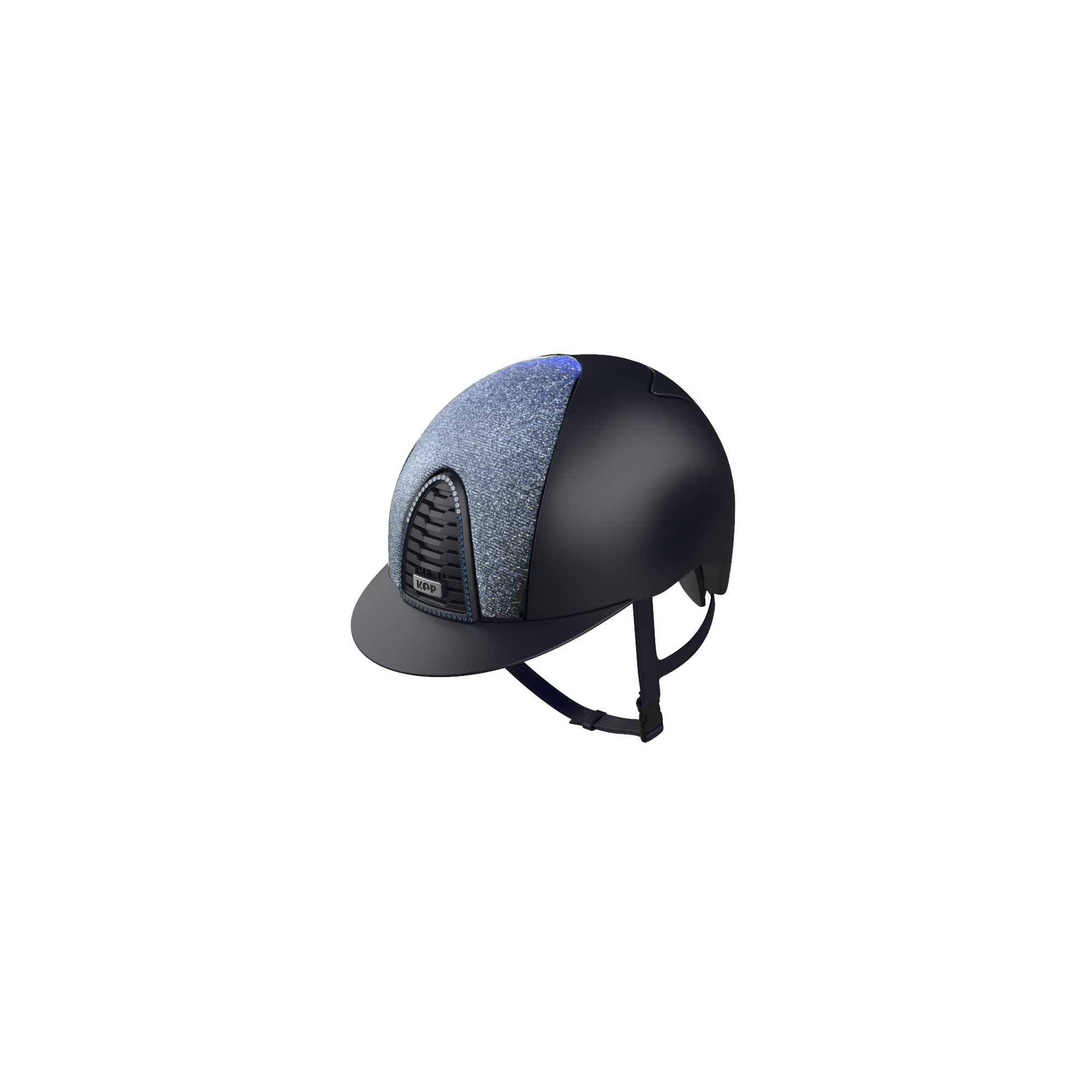 Prezentowany model występuje w kolorze granatowym, posiada matową skorupę, a dodatkowa wstawka w odcieniach niebieskiego dodaje kompozycji subtelnego błysku. Elementem ozdobnym jest również kratka wentylacyjna, która pokryta została kryształkami w różnych odcieniach niebieskiego. Jest to idealne rozwiązanie dla osób, które uwielbiają łączyć klasyczne kolory z nietuzinkowymi zdobieniami.