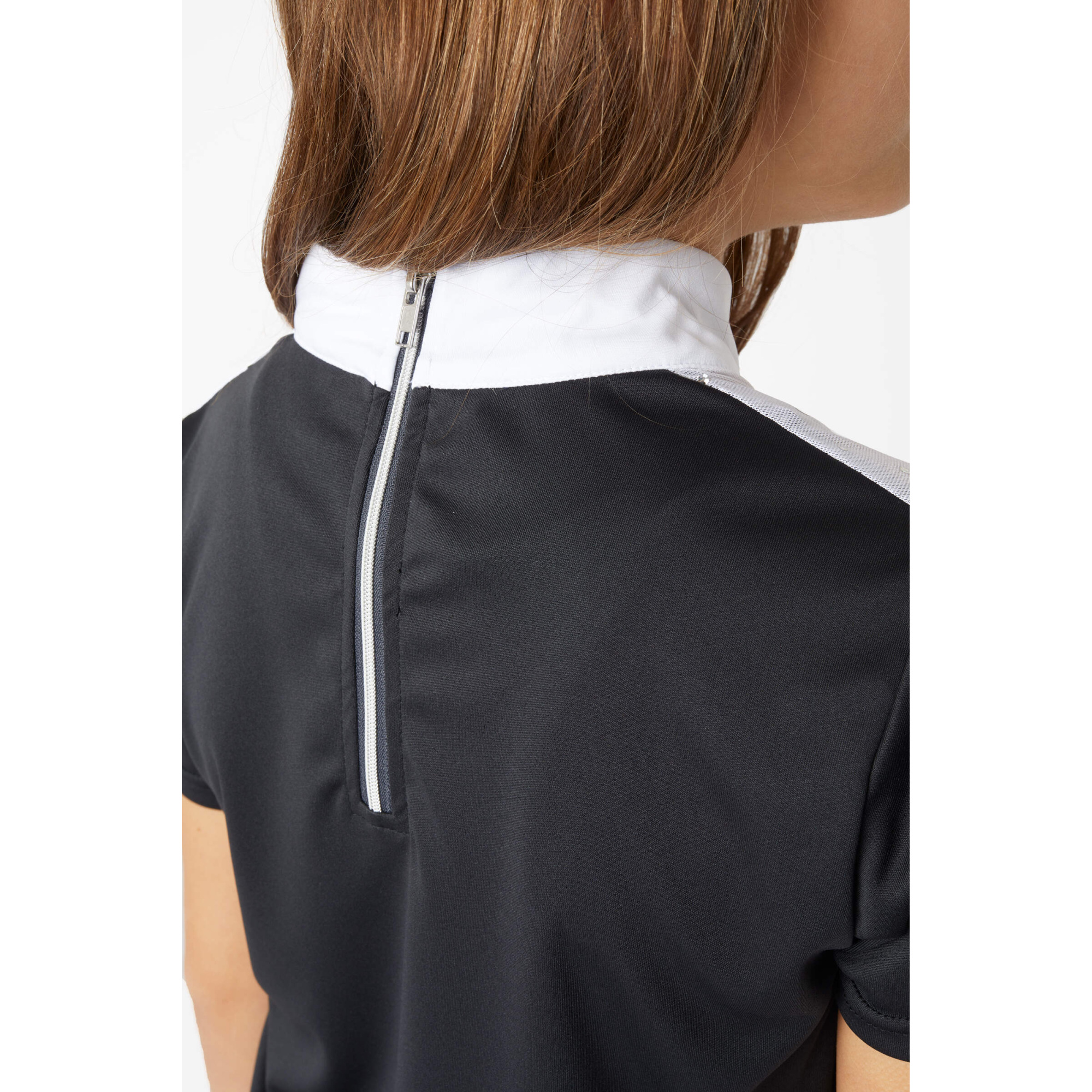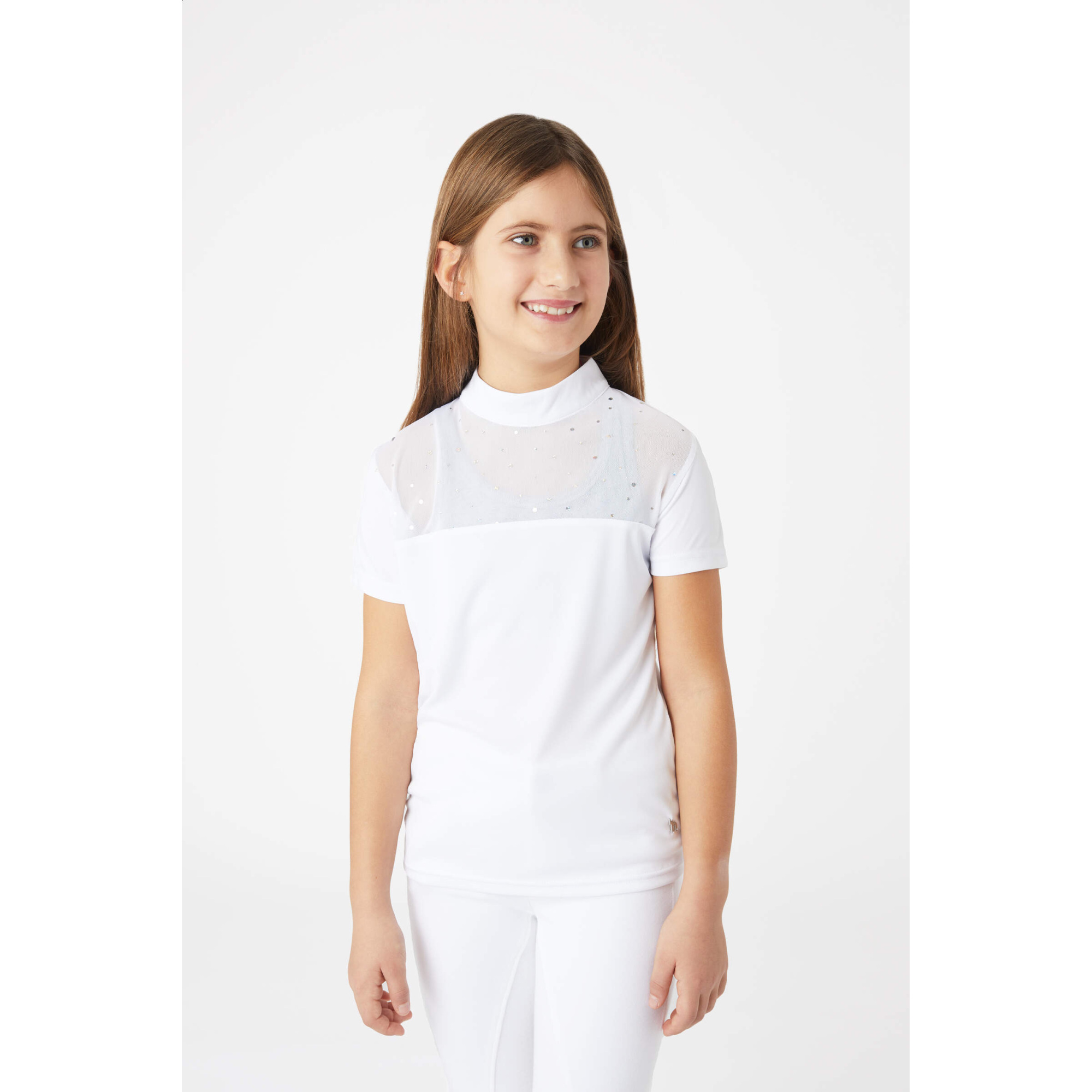 Koszula na zawody jeździeckie Kaya posiada pięknie ozdobiony, siatkowany tors, wykonany z mieniących się kryształków. Wyjątkowy dekor pozwala nam stworzyć niesamowita stylizację, pełną elegancji i szyku.