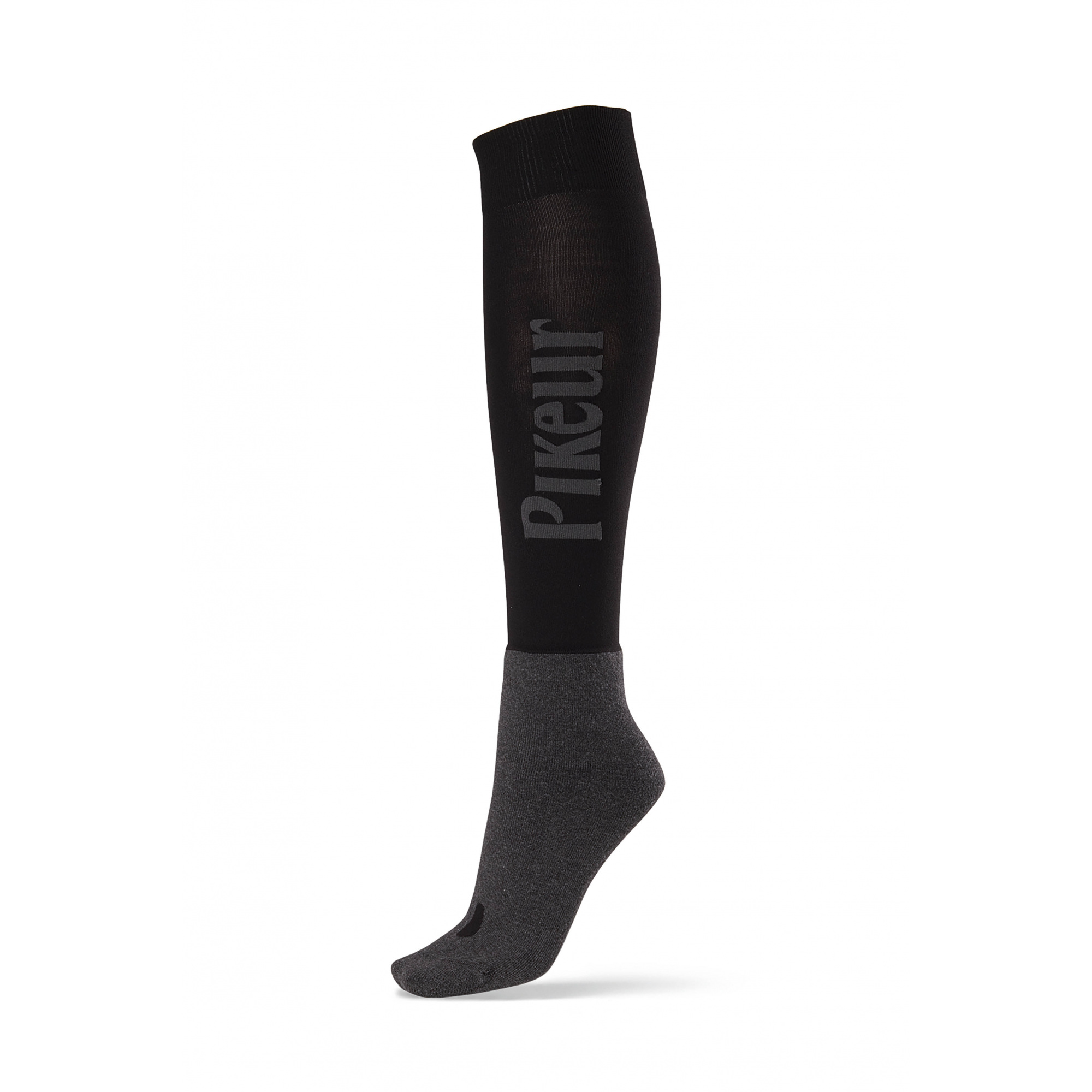 Skarpety jeździeckie firmy Pikeur. Zostały wykonane z wysokiej jakości materiału, który doskonale przepuszcza powietrze oraz zapewnia wysoki poziom komfortu osobistego. W górnej części dodano ściągacz, który utrzymuje skarpety stabilnie podczas jazdy konnej a w dolnej części dodano grubszą warstwę materiału, który jest odporny na rozdarcie. Dekoracyjnie na całej długości łydki umieszczono logo firmy Pikeur.
