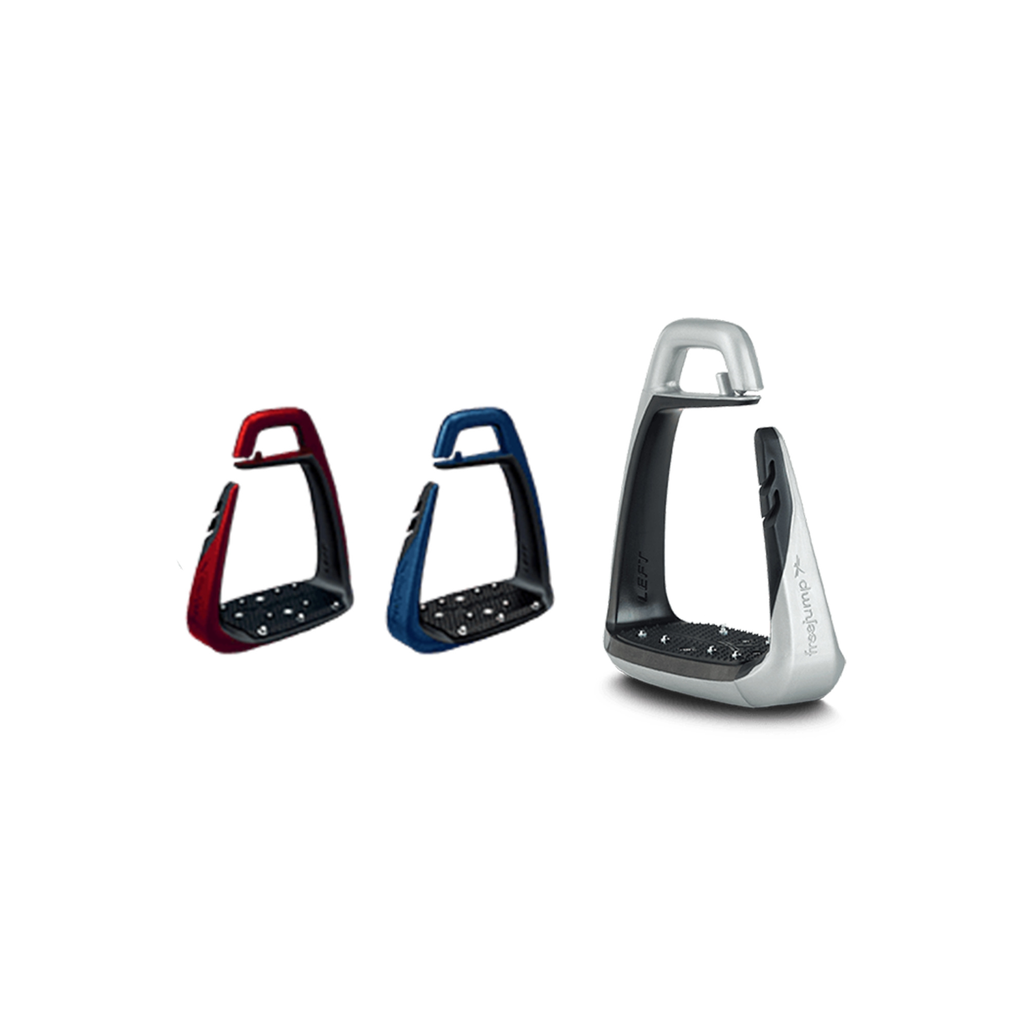 Bezpieczne strzemiona jeździeckie renomowanej marki Freejump, zaprojektowane tak, aby na wypadek niebezpiecznej sytuacji otworzyły się pod naciskiem stopy i uwolniły nogę jeźdźca.