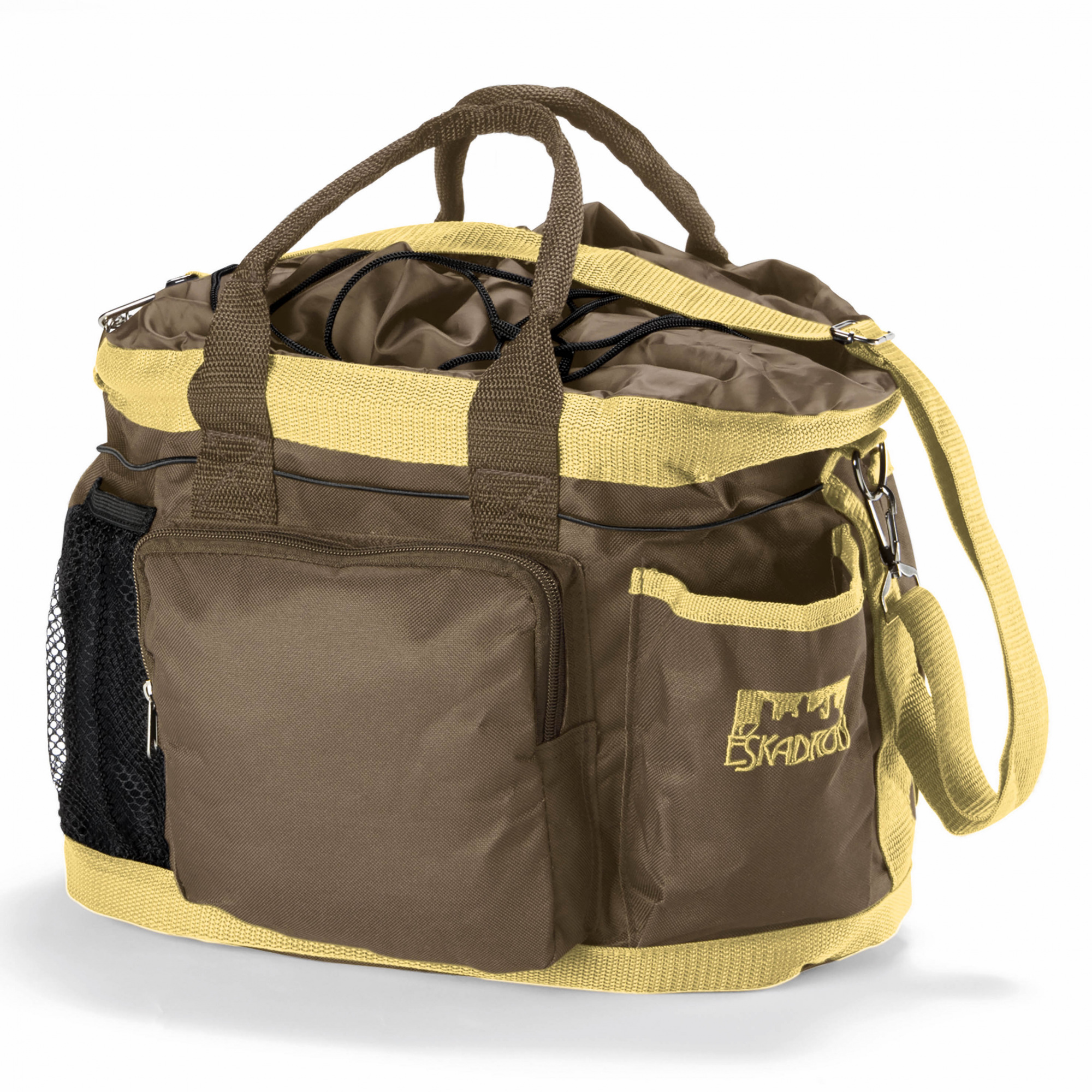 Torba na akcesoria wykonana została z mocnej tkaniny. Bardzo przydatna w stajni jak również na zawodach. Bardzo pojemna posiada wiele kieszonek wewnątrz oraz na zewnątrz. Dno torby zostało usztywnione dzięki czemu torba jest stabilniejsza. Zamykana na zaciągany sznurek. Wyposażona w dwa uchwyty do noszenia w ręce, a także jeden regulowany pas na ramię. Na jednej z zewętrznych kieszeni najduje się logo firmy Eskadron. Dostępna jest w kilku wariantach kolorystycznych.