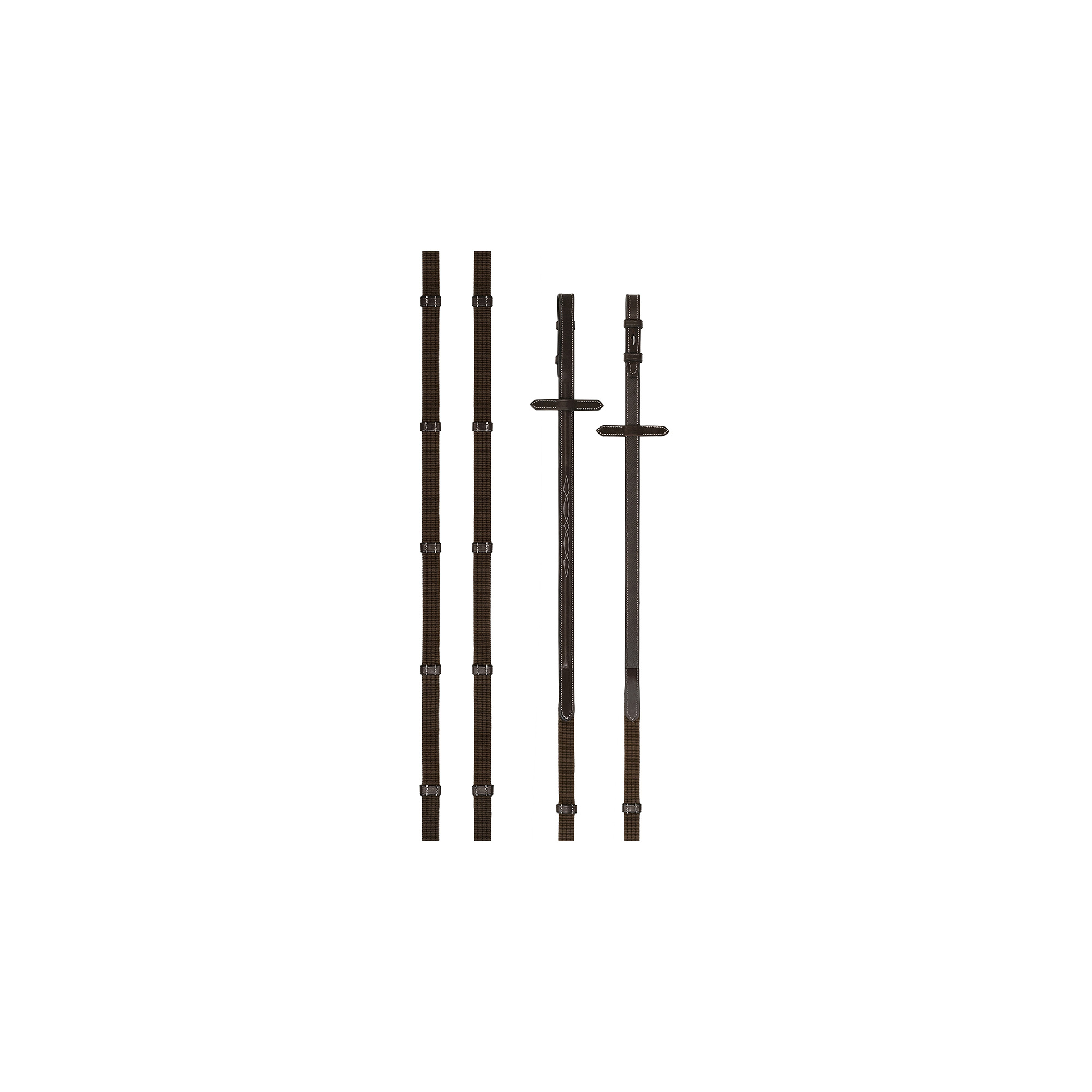 Wodze uszyte zostały z mocnej a jednocześnie miękkiej taśmy parcianej oraz wysokiej jakości skóry naturalnej. Parciana część przeszyta została skórzanymi stoperami, co ułatwia utrzymanie stabilnej uchwytu dłoni na wodzy oraz utryzmanie wodzy równej długości. Skóra naturalna została zaimpregnowana co chroni ją przed działaniem potu konia. Skórzana część została ozdobiona elaganckim, kontrastującym przeszyciem, co czyni je doskonałym kompletem do modeli ogłowi Prestige Italia E37/E80/E83. Wodze przypinane są do kółek wędzidłowych za pomocą zapięcia na haczyk.